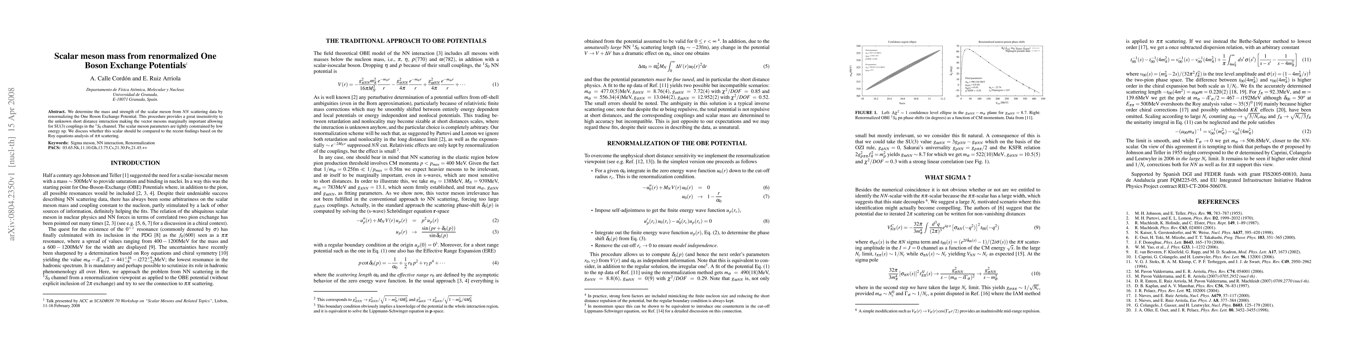 We determine the mass and strength of the scalar meson from NN scattering data by renormalizing the One Boson Exchange Potential. This procedure provides a great insensitivity to the unknown short distance interaction making the vector mesons marginally important and allowing for SU(3) couplings in the 1S0 channel. The scalar meson parameters are tightly constrained by low energy np. We discuss whether this scalar should be compared to the recent findings based on the Roy equations analysis of pipi scattering.