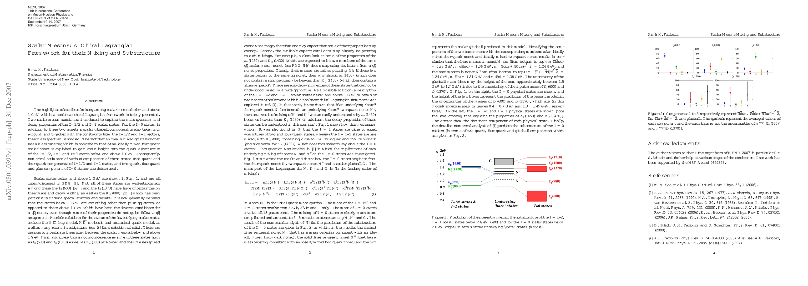 The highlights of studies of mixing among scalar mesons below and above 1 GeV within a nonlinear chiral Lagrangian framework is briefly presented. Two scalar meson nonets are introduced to explore the mass spectrum and decay properties of the $I$=1/2 and $I$=1 scalar states. For the $I$=0 states, in addition to these two nonets a scalar glueball component is also taken into account, and together with the constraints from the $I$=1/2 and $I$=1 sectors, their mass spectrum is studied. The fact that an ideally mixed $q {\bar q}$ scalar nonet has a mass ordering which is opposite to that of an ideally mixed four-quark scalar nonet is exploited to gain some insight into the quark substructure of the $I$=1/2, $I$=1 and $I$=0 states below and above 1 GeV. Consequently, numerical estimates of various components of these states (two quark and four quark components of $I$=1/2 and $I$=1 states, and two quark, four quark and glue component of $I$=0 states) are determined.