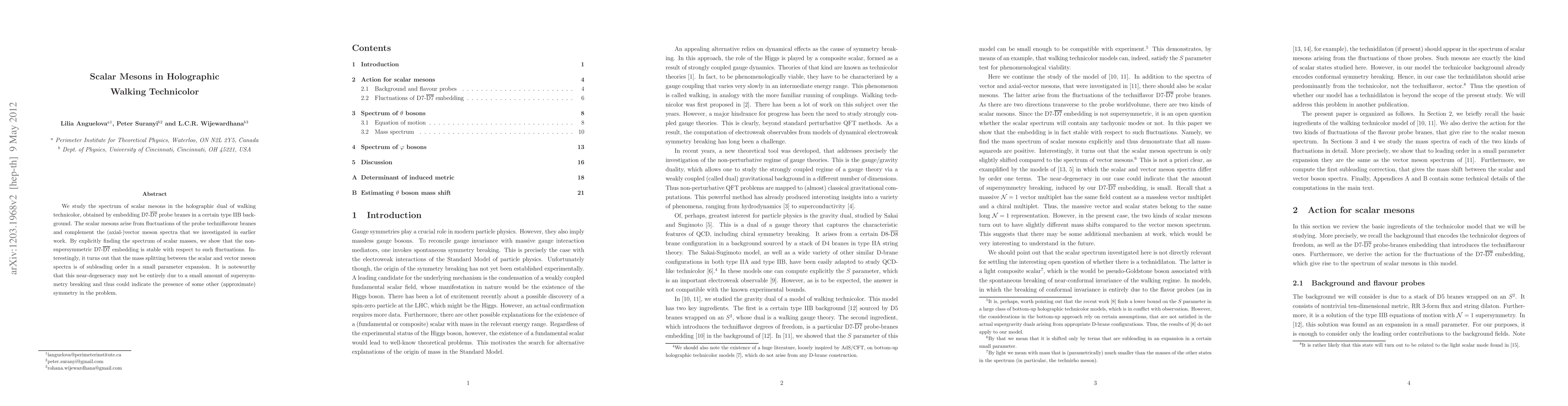 This paper investigates the spectrum of scalar mesons in a holographic model of walking technicolor, showing that the nonsupersymmetric D7-anti-D7 probe brane embedding is stable. The study finds a near-degeneracy between scalar and vector meson masses, suggesting the presence of an approximate symmetry beyond simple supersymmetry breaking.