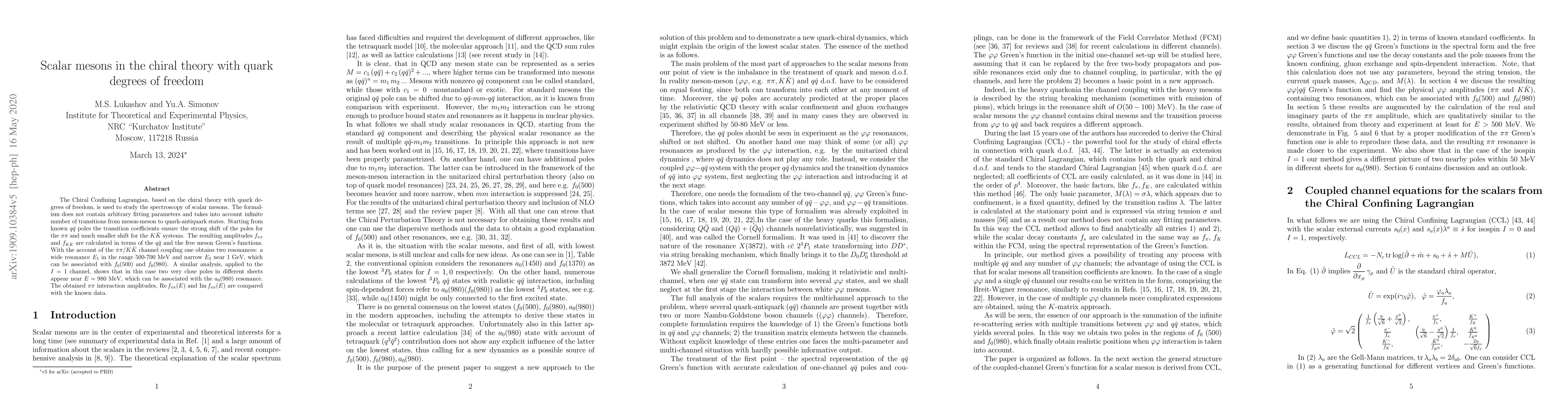 The Chiral Confining Lagrangian, based on the chiral theory with quark degrees of freedom, is used to study the spectroscopy of scalar mesons. The formalism does not contain arbitrary fitting parameters and takes into account infinite number of transitions from meson-meson to quark-antiquark states. Starting from known $q\bar q$ poles the transition coefficients ensure the strong shift of the poles for the $\pi\pi$ and much smaller shift for the $K\bar K$ systems. The resulting amplitudes $f_{\pi\pi}$ and $f_{K\bar K}$ are calculated in terms of the $q\bar q$ and the free meson Green's functions. With the account of the $\pi\pi/K\bar{K}$ channel coupling one obtains two resonances: a wide resonance $E_1$ in the range 500-700 MeV and narrow $E_2 $ near 1 GeV, which can be associated with $f_0(500)$ and $f_0(980)$. A similar analysis, applied to the $I=1$ channel, shows that in this case two very close poles in different sheets appear near $E=980$ MeV, which can be associated with the $a_0 (980)$ resonance. The obtained $\pi\pi$ interaction amplitudes, $\operatorname{Re} f_{\pi\pi} (E)$ and $\operatorname{Im} f_{\pi\pi}(E)$ are compared with the known data.