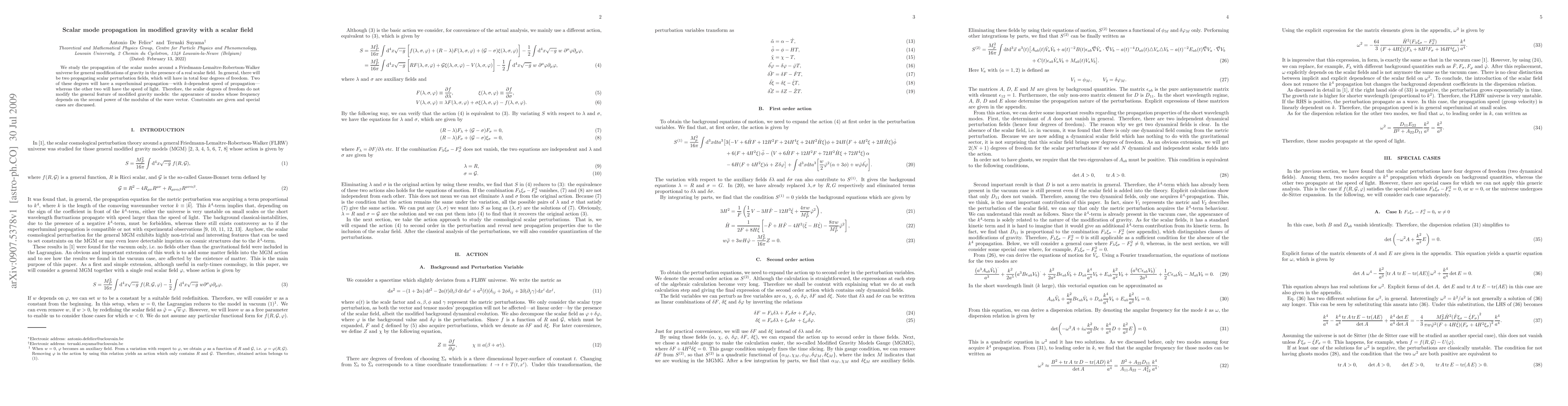 We study the propagation of the scalar modes around a Friedmann-Lemaitre-Robertson-Walker universe for general modifications of gravity in the presence of a real scalar field. In general, there will be two propagating scalar perturbation fields, which will have in total four degrees of freedom. Two of these degrees will have a superluminal propagation--with k-dependent speed of propagation--whereas the other two will travel with the speed of light. Therefore, the scalar degrees of freedom do not modify the general feature of modified gravity models: the appearance of modes whose frequency depends on the second power of the modulus of the wave vector. Constraints are given and special cases are discussed.