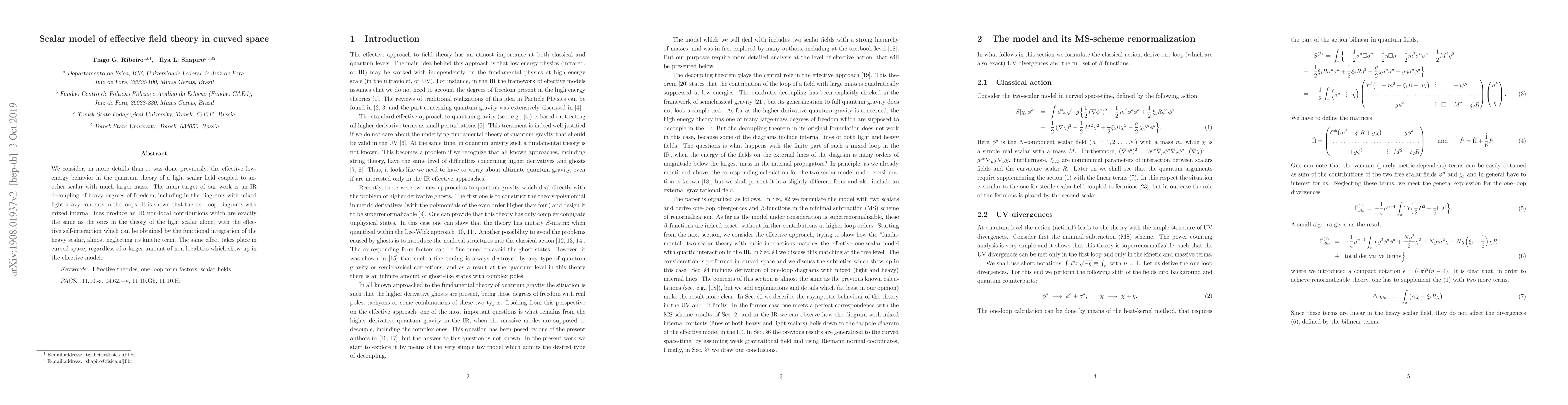This paper explores the effective low-energy behavior of a light scalar field coupled to a much heavier scalar in both flat and curved spacetimes, demonstrating IR decoupling of heavy degrees of freedom. It finds that one-loop diagrams with mixed internal lines produce IR non-local contributions identical to those in the theory of the light scalar alone, with effective self-interactions derived from the heavy scalar's integration.
