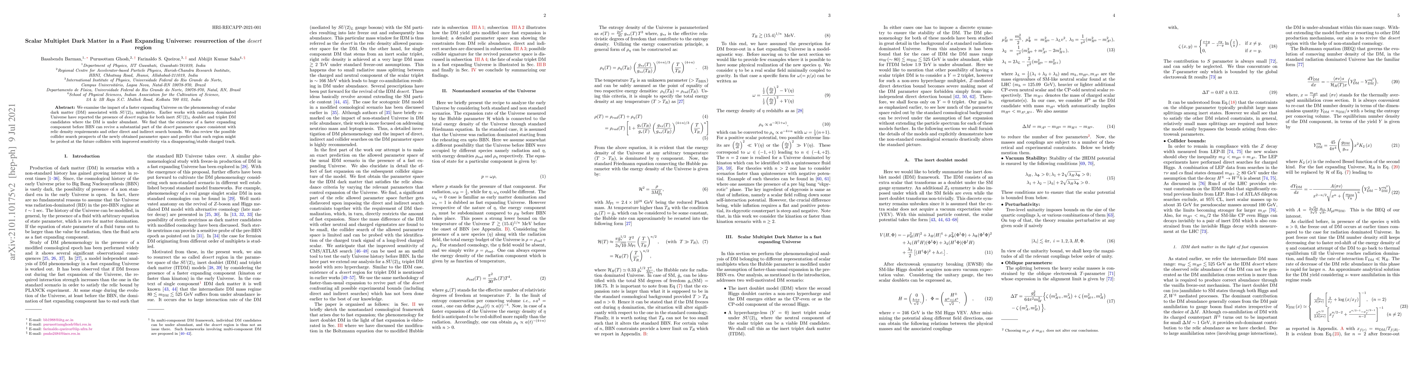 We examine the impact of a faster expanding Universe on the phenomenology of scalar dark matter (DM) associated with $SU(2)_L$ multiplets. Earlier works with radiation dominated Universe have reported the presence of desert region for both inert $SU(2)_L$ doublet and triplet DM candidates where the DM is under abundant. We find that the existence of a faster expanding component before BBN can revive a substantial part of the desert parameter space consistent with relic density requirements and other direct and indirect search bounds. We also review the possible collider search prospects of the newly obtained parameter space and predict that such region might be probed at the future colliders with improved sensitivity via a disappearing/stable charged track.