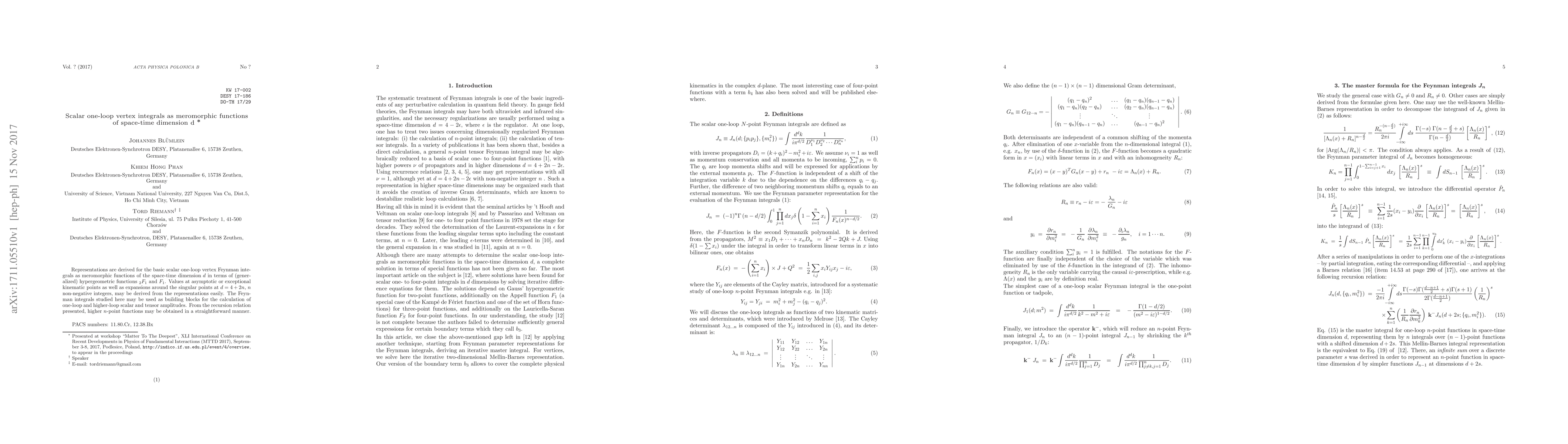 Representations are derived for the basic scalar one-loop vertex Feynman integrals as meromorphic functions of the space-time dimension $d$ in terms of (generalized) hypergeometric functions $_2F_1$ and $F_1$. Values at asymptotic or exceptional kinematic points as well as expansions around the singular points at $d=4+2n$, $n$ non-negative integers, may be derived from the representations easily. The Feynman integrals studied here may be used as building blocks for the calculation of one-loop and higher-loop scalar and tensor amplitudes. From the recursion relation presented, higher n-point functions may be obtained in a straightforward manner.