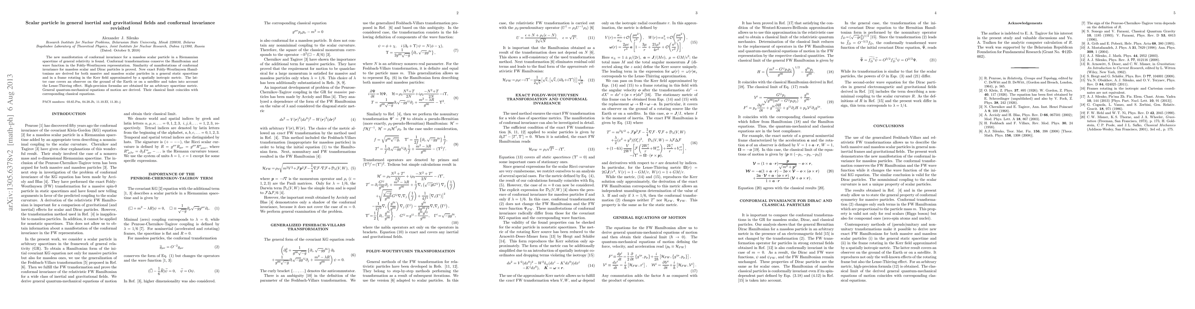 The new manifestation of conformal invariance for a massless scalar particle in a Riemannian spacetime of general relativity is found. Conformal transformations conserve the Hamiltonian and wave function in the Foldy-Wouthuysen representation. Similarity of manifestations of conformal invariance for massless scalar and Dirac particles is proved. New exact Foldy-Wouthuysen Hamiltonians are derived for both massive and massless scalar particles in a general static spacetime and in a frame rotating in the Kerr field approximated by a spatially isotropic metric. The latter case covers an observer on the ground of the Earth or on a satellite and takes into account the Lense-Thirring effect. High-precision formulas are obtained for an arbitrary spacetime metric. General quantum-mechanical equations of motion are derived. Their classical limit coincides with corresponding classical equations.