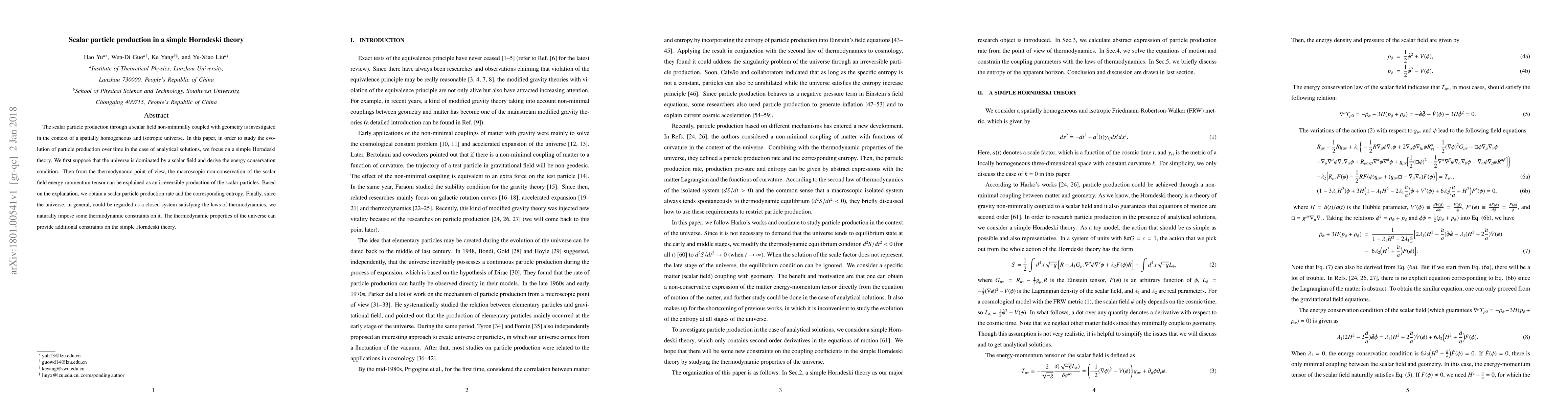 This paper investigates scalar particle production in a simple Horndeski theory, focusing on a universe dominated by a non-minimally coupled scalar field. The study derives an energy conservation condition and explains macroscopic non-conservation as irreversible scalar particle production, leading to a derived production rate and entropy, with thermodynamic constraints providing additional insights into the theory.