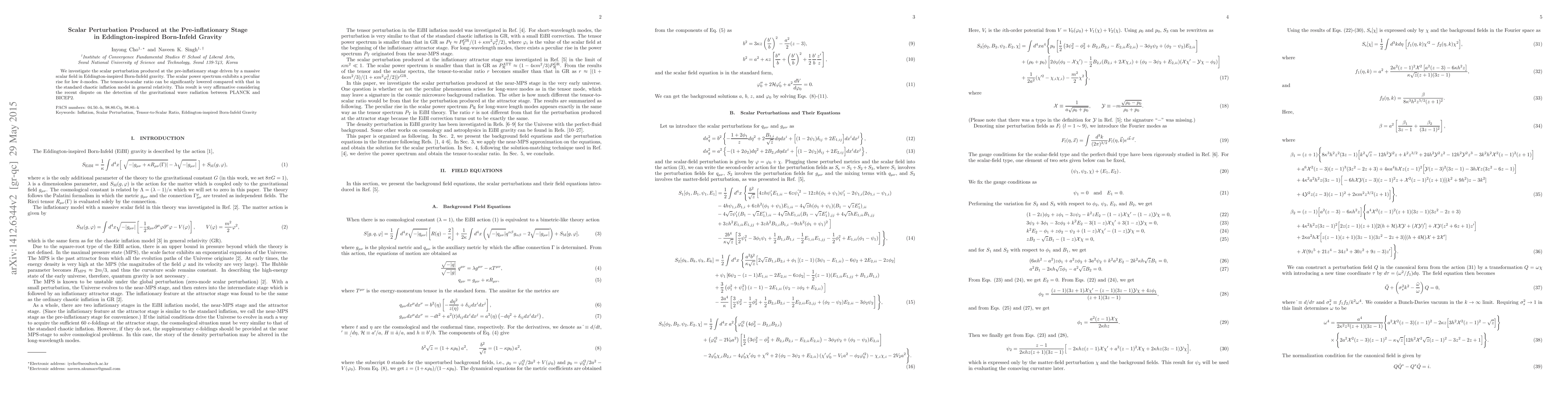 We investigate the scalar perturbation produced at the pre-inflationary stage driven by a massive scalar field in Eddington-inspired Born-Infeld gravity. The scalar power spectrum exhibits a peculiar rise for low $k$-modes. The tensor-to-scalar ratio can be significantly lowered compared with that in the standard chaotic inflation model in general relativity. This result is very affirmative considering the recent dispute on the detection of the gravitational wave radiation between PLANCK and BICEP2.