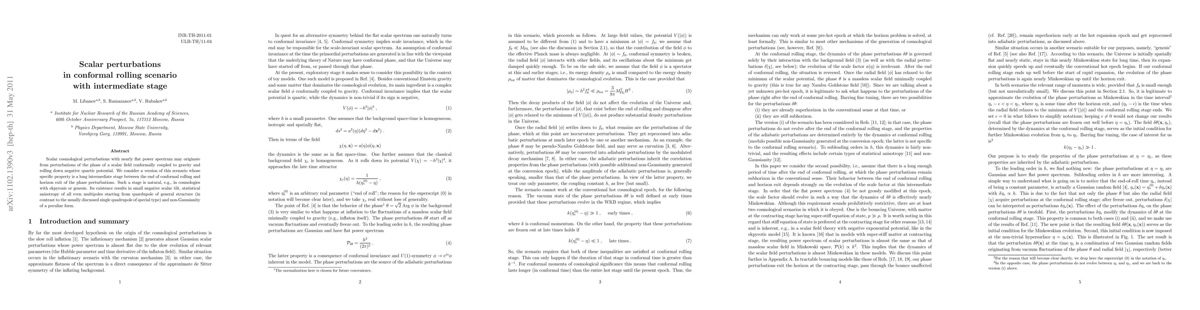 Scalar cosmological perturbations with nearly flat power spectrum may originate from perturbations of the phase of a scalar field conformally coupled to gravity and rolling down negative quartic potential. We consider a version of this scenario whose specific property is a long intermediate stage between the end of conformal rolling and horizon exit of the phase perturbations. Such a stage is natural, e.g., in cosmologies with ekpyrosis or genesis. Its existence results in small negative scalar tilt, statistical anisotropy of all even multipoles starting from quardupole of general structure (in contrast to the usually discussed single quadrupole of special type) and non-Gaussianity of a peculiar form.