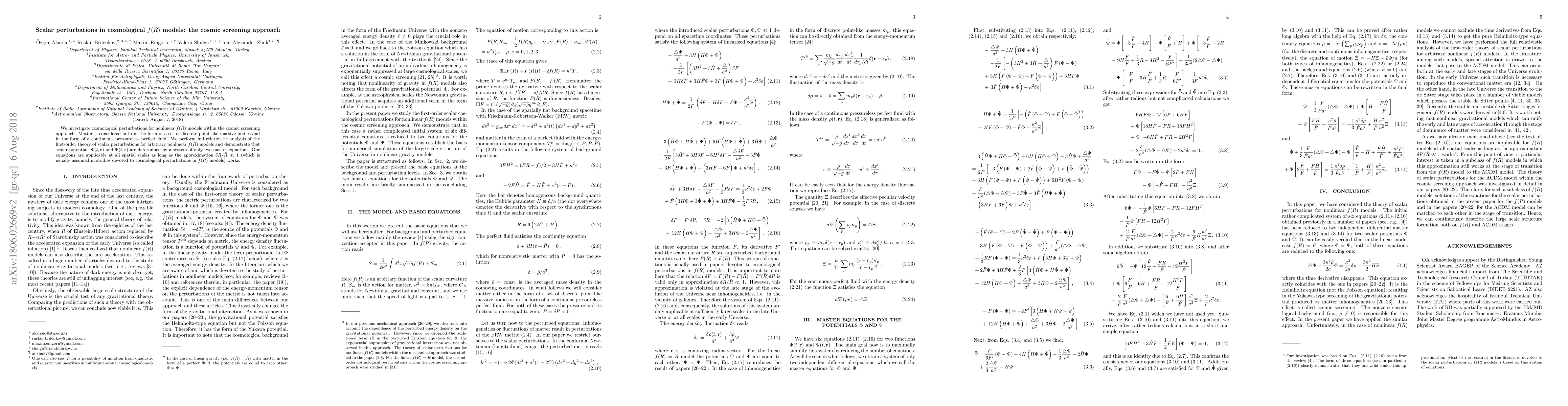This paper explores cosmological perturbations in nonlinear $f(R)$ models using the cosmic screening approach, analyzing both discrete and continuous matter distributions. The authors derive two master equations for scalar potentials $\Phi$ and $\Psi$ applicable across all spatial scales under the small curvature perturbation assumption.