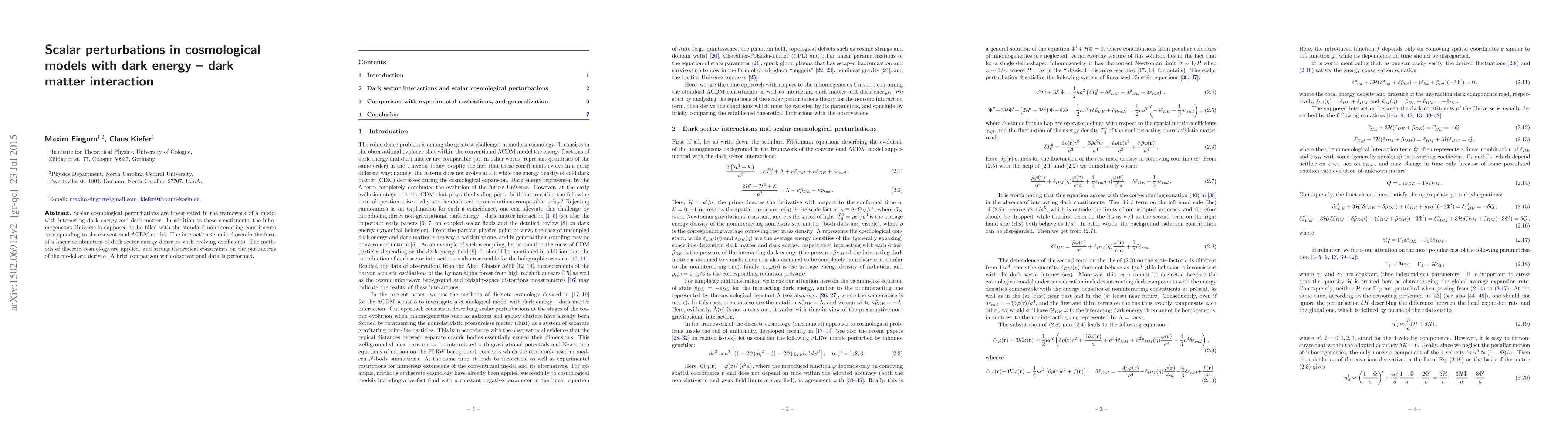 This paper investigates scalar cosmological perturbations in a model where dark energy and dark matter interact linearly, alongside standard noninteracting components of the $\Lambda$CDM model. Discrete cosmology methods are used to derive strong theoretical constraints on the model parameters, and a preliminary comparison with observational data is made.