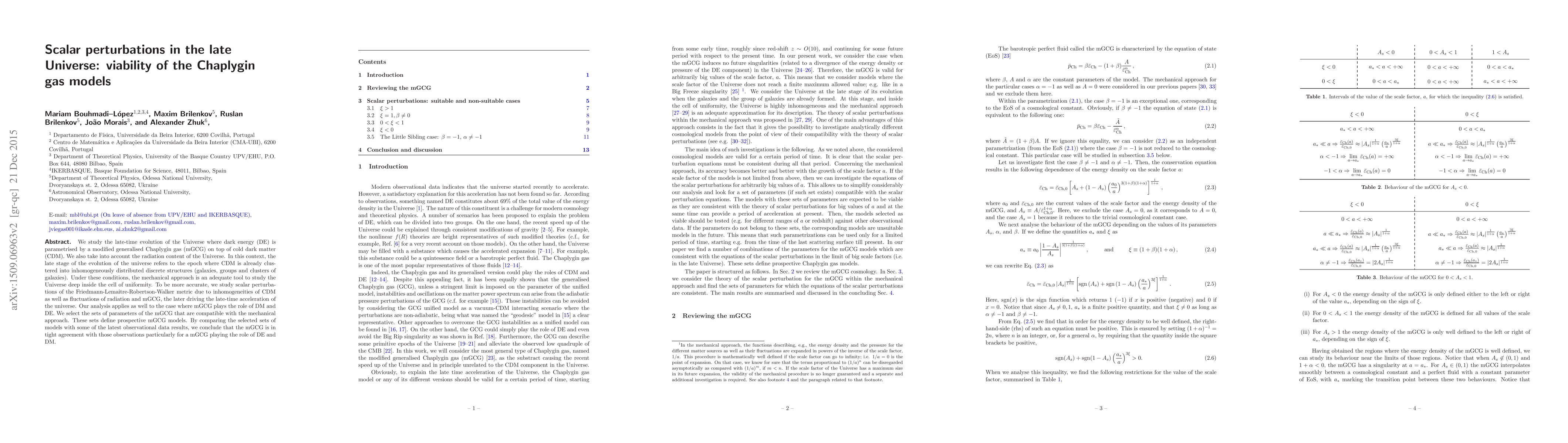 This paper investigates the late-time evolution of the Universe using a modified generalized Chaplygin gas (mGCG) model for dark energy, alongside cold dark matter and radiation. It finds scalar perturbations compatible with observational data, suggesting that mGCG models can effectively describe the universe's late-time acceleration and structure formation.
