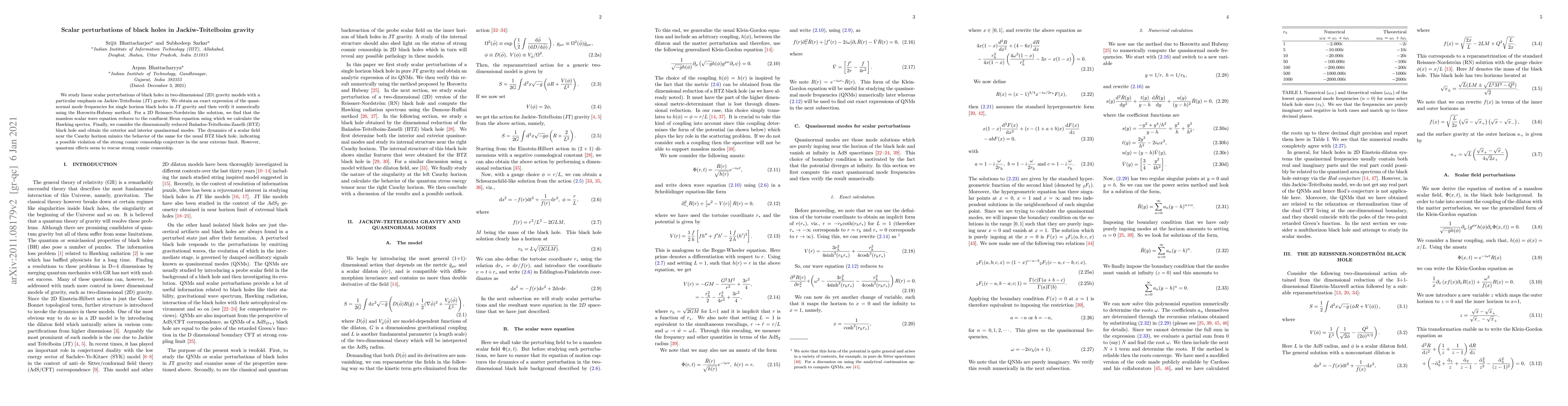 This paper investigates scalar perturbations in Jackiw-Teitelboim (JT) gravity, deriving exact quasinormal mode frequencies for single horizon black holes and verifying them numerically. It also explores the massless scalar wave equation in 2D Reissner-Nordström-like solutions and the dynamics near the Cauchy horizon, suggesting potential violations of the strong cosmic censorship conjecture, though quantum effects may restore it.
