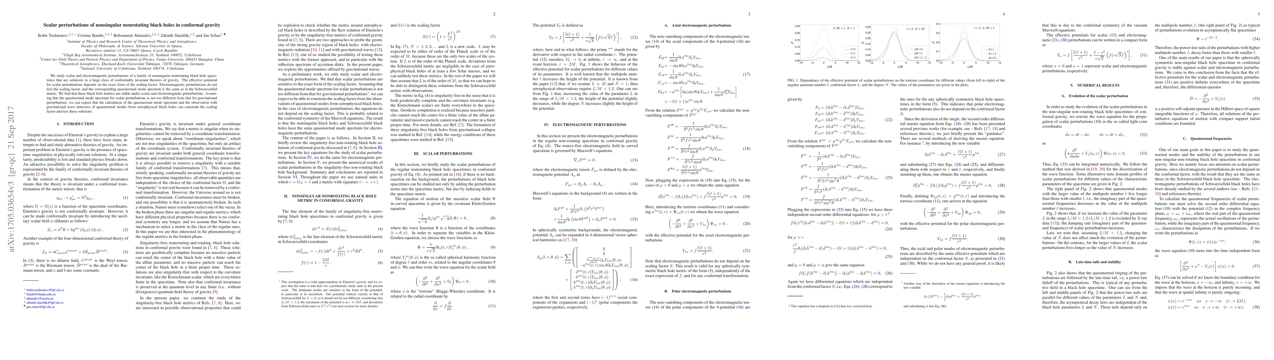 This paper investigates scalar and electromagnetic perturbations of nonsingular, nonrotating black holes in conformal gravity, finding that these black holes are stable under both types of perturbations. The effective scalar perturbation potential depends on the scaling factor, while electromagnetic perturbations behave similarly to those in a Schwarzschild metric.
