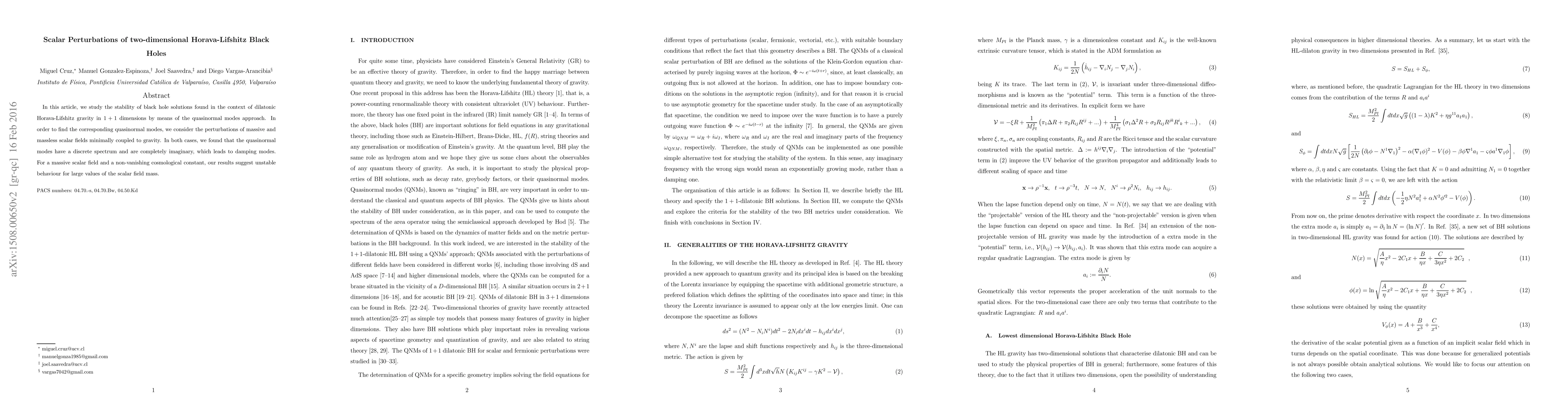 This paper investigates the stability of two-dimensional Horava-Lifshitz black holes via quasinormal modes of scalar perturbations. It finds discrete, imaginary quasinormal modes indicating damping, with unstable behavior for large scalar field masses and non-zero cosmological constants.