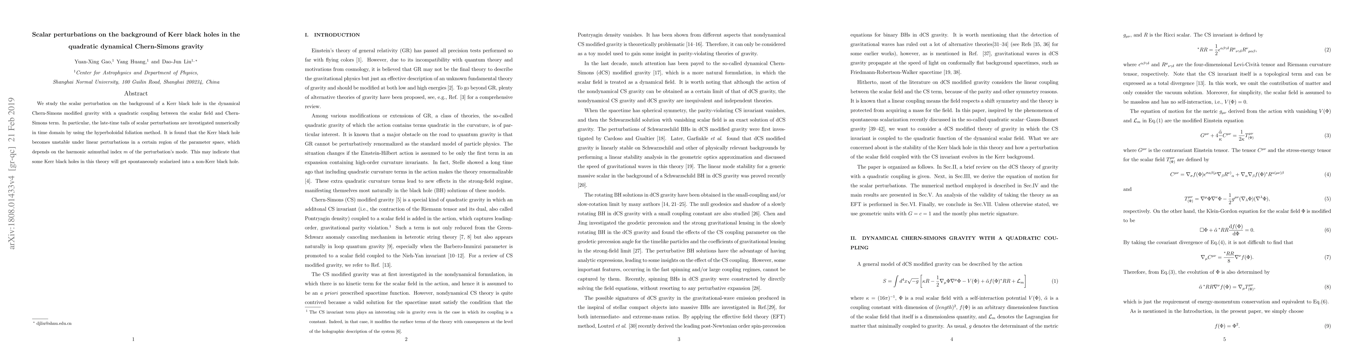 This paper investigates scalar perturbations on Kerr black holes in quadratic dynamical Chern-Simons gravity, revealing instability in certain parameter spaces and suggesting spontaneous scalarization of some Kerr black holes into non-Kerr configurations. Numerical simulations using the hyperboloidal foliation method highlight the late-time tails of these perturbations.