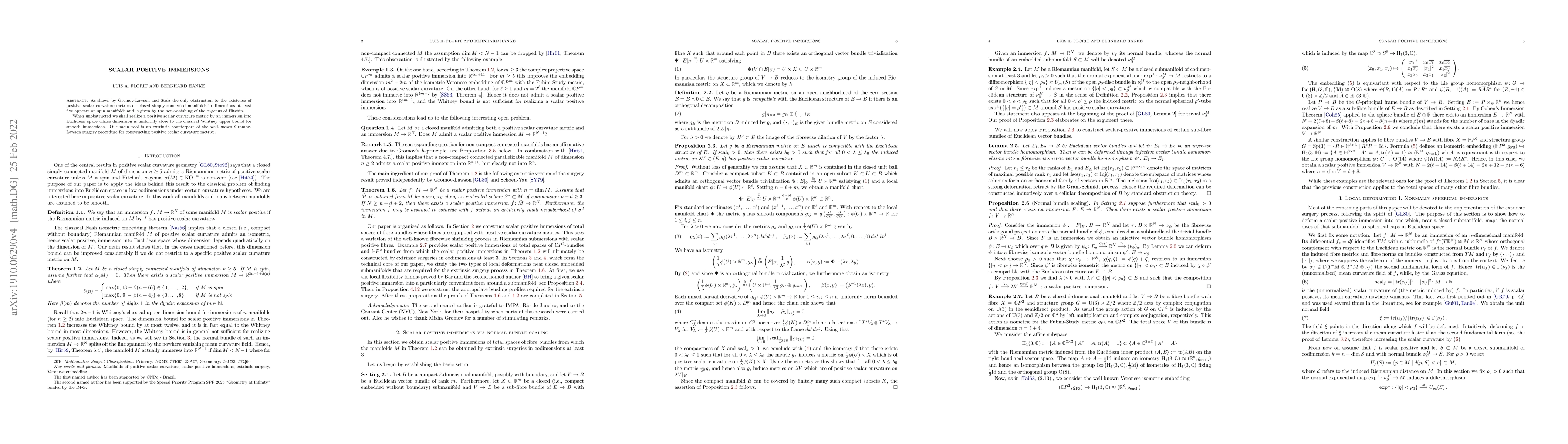 This paper explores how to construct positive scalar curvature metrics on spin manifolds by using immersions into Euclidean space, showing that obstructions to such metrics are tied to the $\alpha$-genus of Hitchin. It employs an extrinsic surgery procedure akin to Gromov-Lawson’s method to achieve these immersions close to the Whitney upper bound.