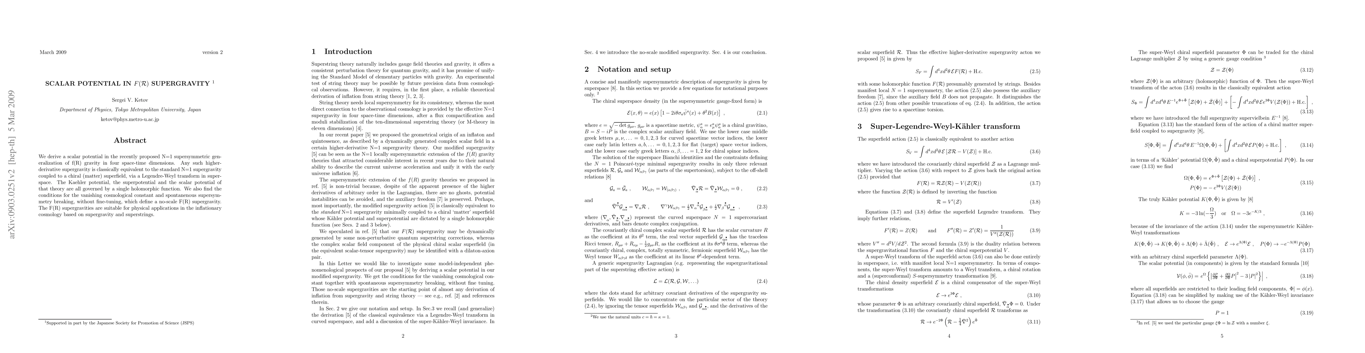 We derive a scalar potential in the recently proposed N=1 supersymmetric generalization of f(R) gravity in four space-time dimensions. Any such higher-derivative supergravity is classically equivalent to the standard N=1 supergravity coupled to a chiral (matter) superfield, via a Legendre-Weyl transform in superspace. The Kaehler potential, the superpotential and the scalar potential of that theory are all governed by a single holomorphic function. We also find the conditions for the vanishing cosmological constant and spontaneous supersymmetry breaking, without fine-tuning, which define a no-scale F(R) supergravity. The F(R) supergravities are suitable for physical applications in the inflationary cosmology based on supergravity and superstrings.