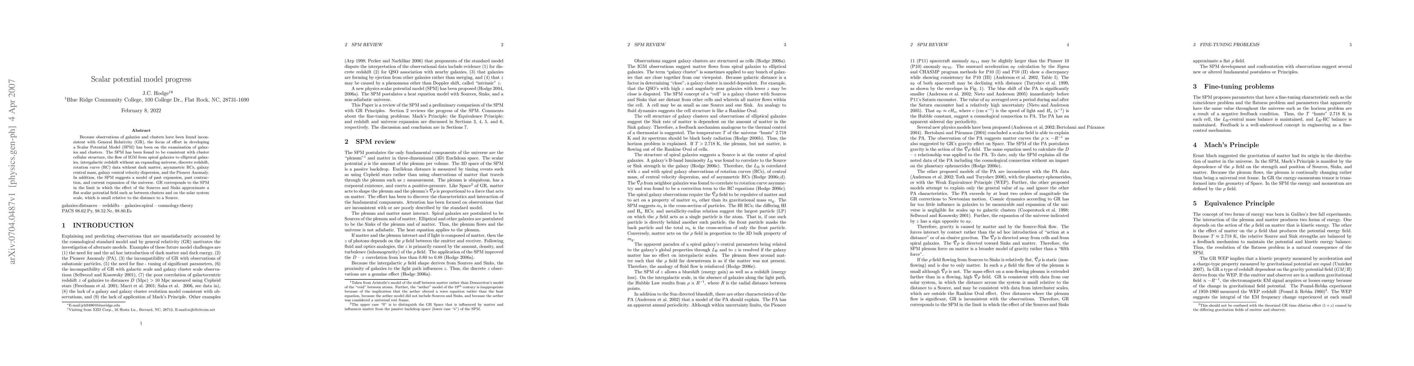 Because observations of galaxies and clusters have been found inconsistent with General Relativity (GR), the focus of effort in developing a Scalar Potential Model (SPM) has been on the examination of galaxies and clusters. The SPM has been found to be consistent with cluster cellular structure, the flow of IGM from spiral galaxies to elliptical galaxies, intergalactic redshift without an expanding universe, discrete redshift, rotation curve (RC) data without dark matter, asymmetric RCs, galaxy central mass, galaxy central velocity dispersion, and the Pioneer Anomaly. In addition, the SPM suggests a model of past expansion, past contraction, and current expansion of the universe. GR corresponds to the SPM in the limit in which the effect of the Sources and Sinks approximate a flat scalar potential field such as between clusters and on the solar system scale, which is small relative to the distance to a Source.
