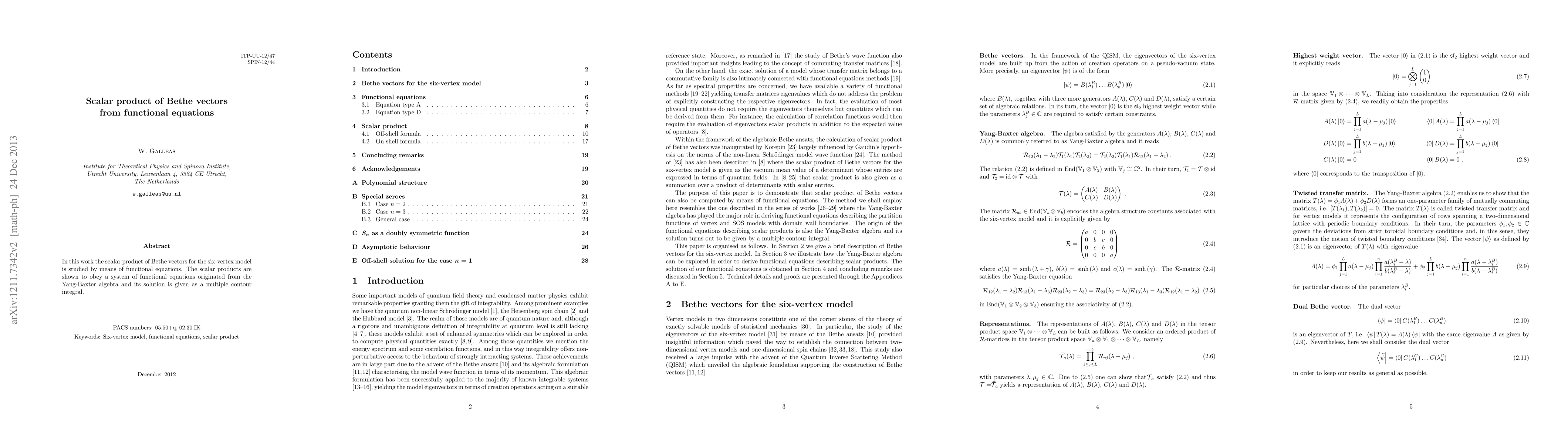 This paper investigates the scalar product of Bethe vectors in the six-vertex model using functional equations derived from the Yang-Baxter algebra, providing a solution expressed as a multiple contour integral.