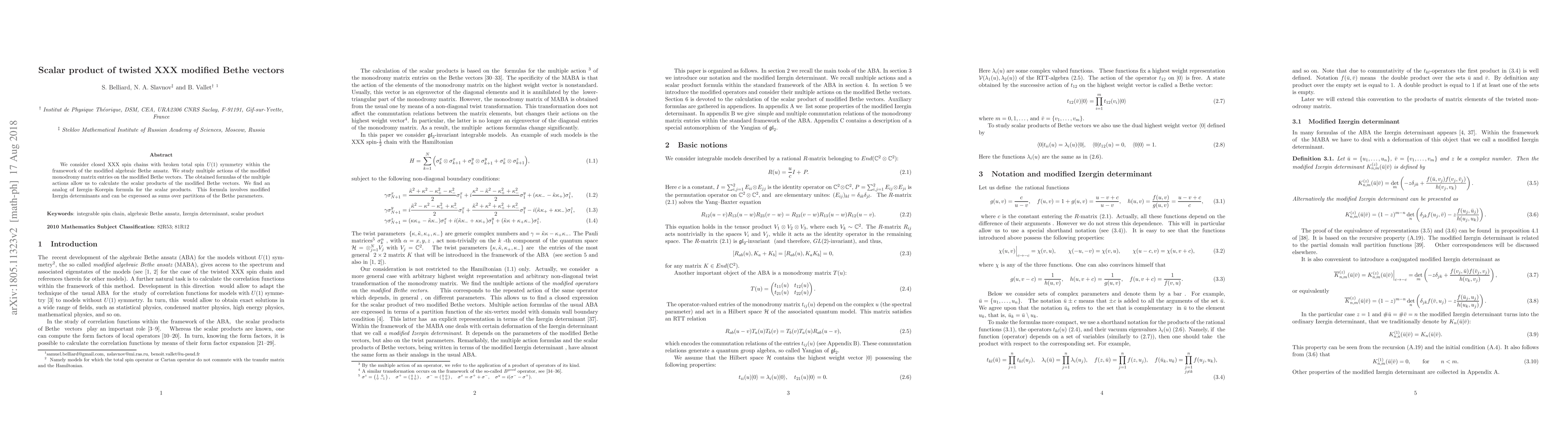 This paper investigates the scalar products of twisted XXX spin chains with broken symmetry using the modified algebraic Bethe ansatz, revealing an analog of the Izergin-Korepin formula expressed through modified Izergin determinants and sums over partitions of Bethe parameters.