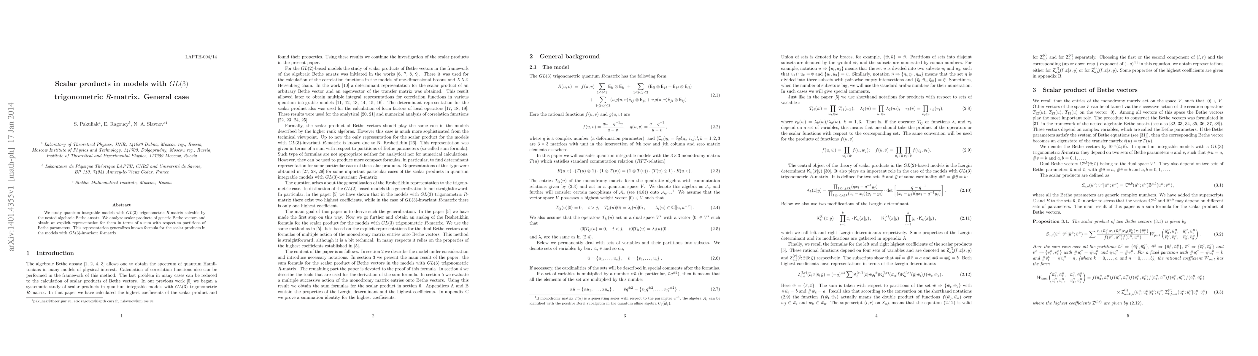 This paper investigates quantum integrable models solvable by the nested algebraic Bethe ansatz, focusing on scalar products of generic Bethe vectors. It provides an explicit representation of these scalar products as a sum over partitions of Bethe parameters, generalizing existing formulas for $GL(3)$-invariant $R$-matrices.