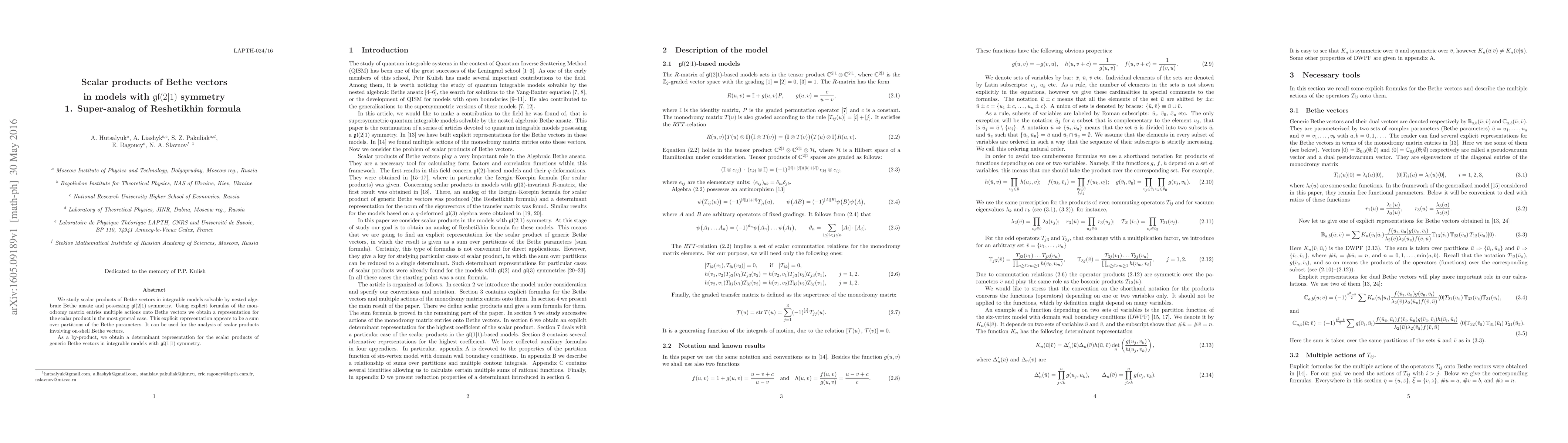 This paper investigates scalar products of Bethe vectors in integrable models with $\mathfrak{gl}(2|1)$ symmetry, deriving an explicit formula as a sum over partitions of Bethe parameters. As a secondary result, it also provides a determinant representation for $\mathfrak{gl}(1|1)$ symmetric models.