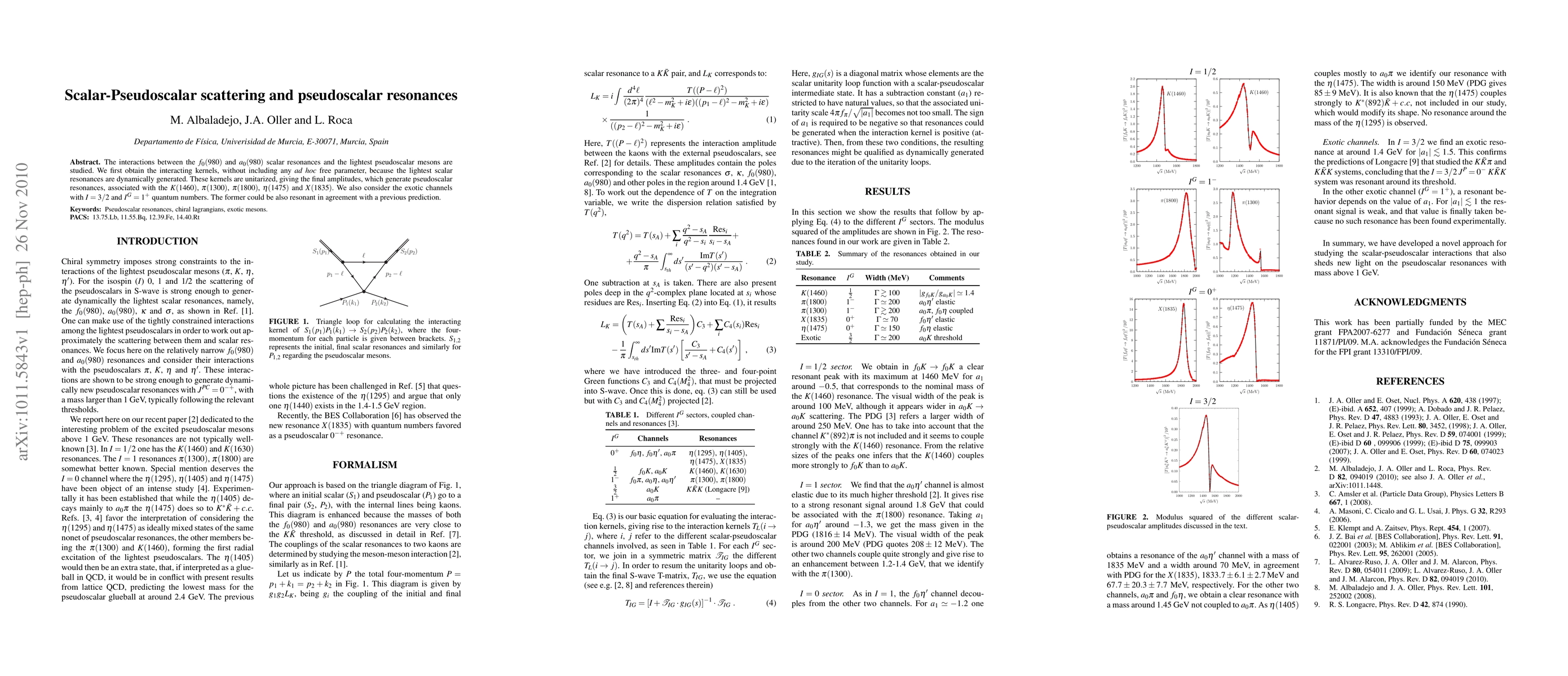 This paper investigates the interactions between the f_0(980) and a_0(980) scalar resonances and the lightest pseudoscalar mesons, deriving unitarized amplitudes that generate pseudoscalar resonances including K(1460), π(1300), π(1800), η(1475), and X(1835). It also explores exotic channels with I=3/2 and I^G=1^+ quantum numbers, potentially resonant as predicted earlier.