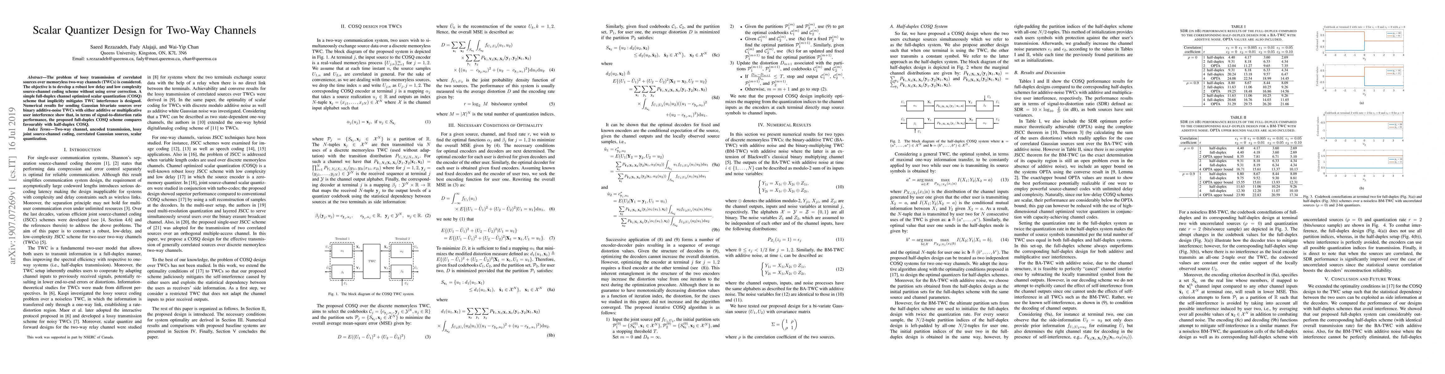 The problem of lossy transmission of correlated sources over memoryless two-way channels (TWCs) is considered. The objective is to develop a robust low delay and low complexity source-channel coding scheme without using error correction. A simple full-duplex channel optimized scalar quantization (COSQ) scheme that implicitly mitigates TWC interference is designed. Numerical results for sending Gaussian bivariate sources over binary additive-noise TWCs with either additive or multiplicative user interference show that, in terms of signal-to-distortion ratio performance, the proposed full-duplex COSQ scheme compares favourably with half-duplex COSQ.