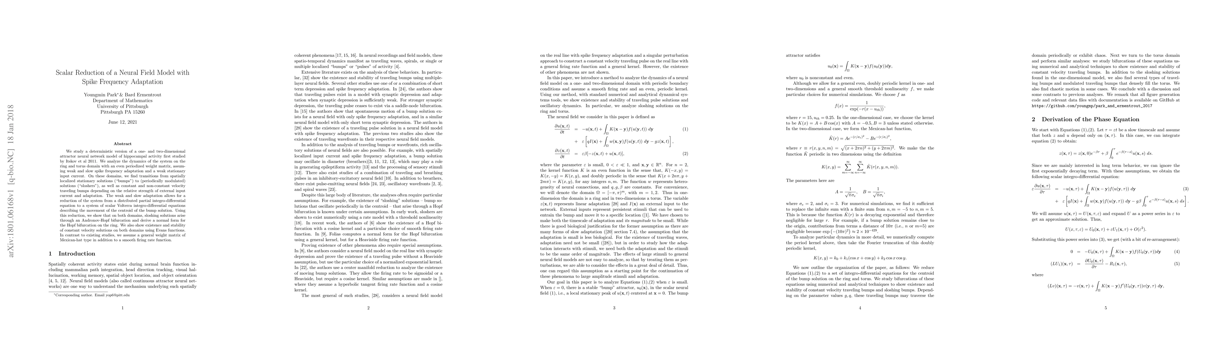 This paper investigates the dynamics of a scalar reduced model derived from a neural field theory with spike frequency adaptation, focusing on transitions between localized and traveling neural activity patterns. It demonstrates the emergence of sloshing solutions via an Andronov-Hopf bifurcation and proves the existence and stability of constant velocity traveling bumps using Evans functions on ring and torus domains.