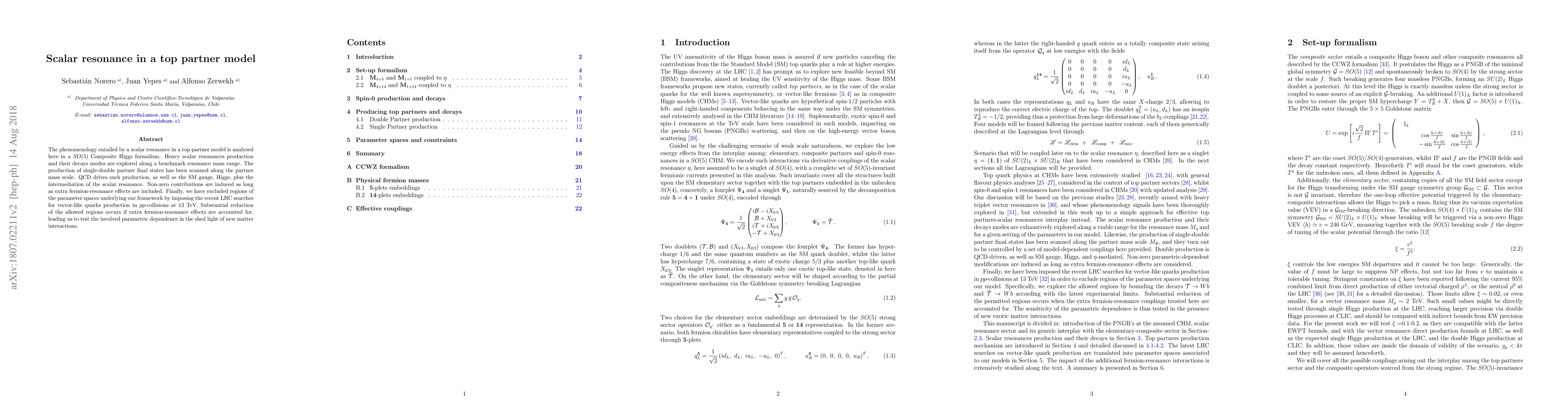 This paper analyzes the phenomenology of scalar resonances in a top partner model within an $SO(5)$ Composite Higgs framework, focusing on heavy scalar production and decay modes. It excludes certain parameter spaces based on recent LHC searches for vector-like quarks, significantly reducing allowed regions when considering extra fermion-resonance effects.