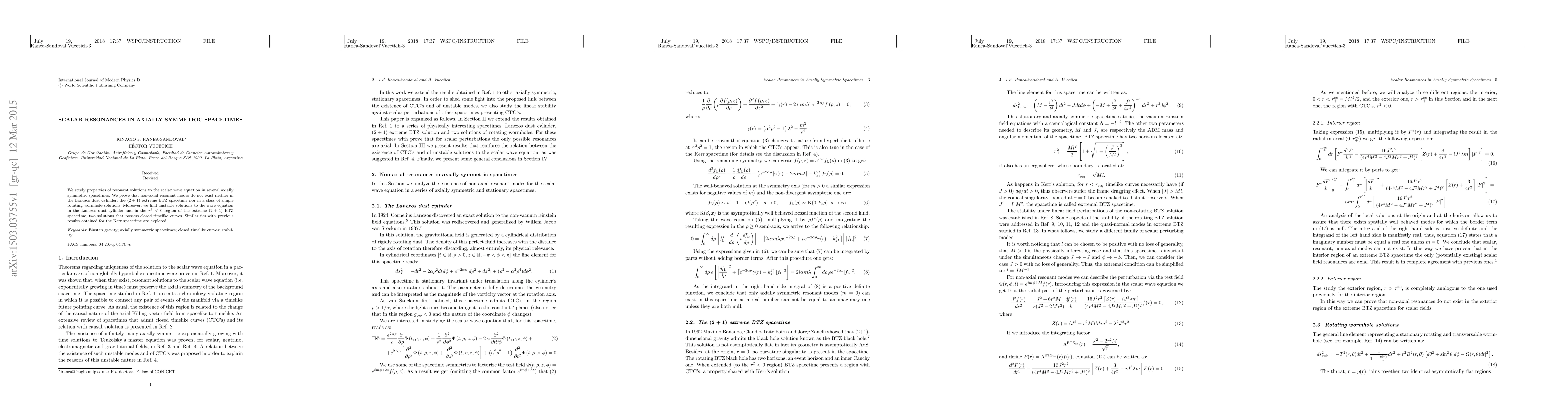 We study properties of resonant solutions to the scalar wave equation in several axially symmetric spacetimes. We prove that non-axial resonant modes do not exist neither in the Lanczos dust cylinder, the $(2+1)$ extreme BTZ spacetime nor in a class of simple rotating wormhole solutions. Moreover, we find unstable solutions to the wave equation in the Lanczos dust cylinder and in the $r^2 <0$ region of the extreme $(2+1)$ BTZ spacetime, two solutions that possess closed timelike curves. Similarities with previous results obtained for the Kerr spacetime are explored.