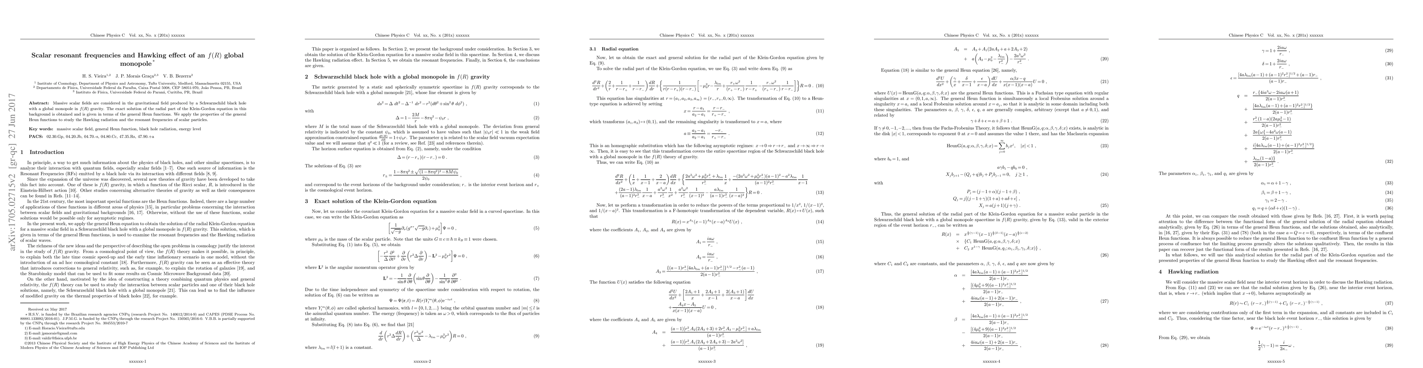 This paper investigates the scalar resonant frequencies and Hawking radiation in the gravitational field of a Schwarzschild black hole with a global monopole in $f(R)$ gravity, deriving exact solutions using general Heun functions to analyze these phenomena.
