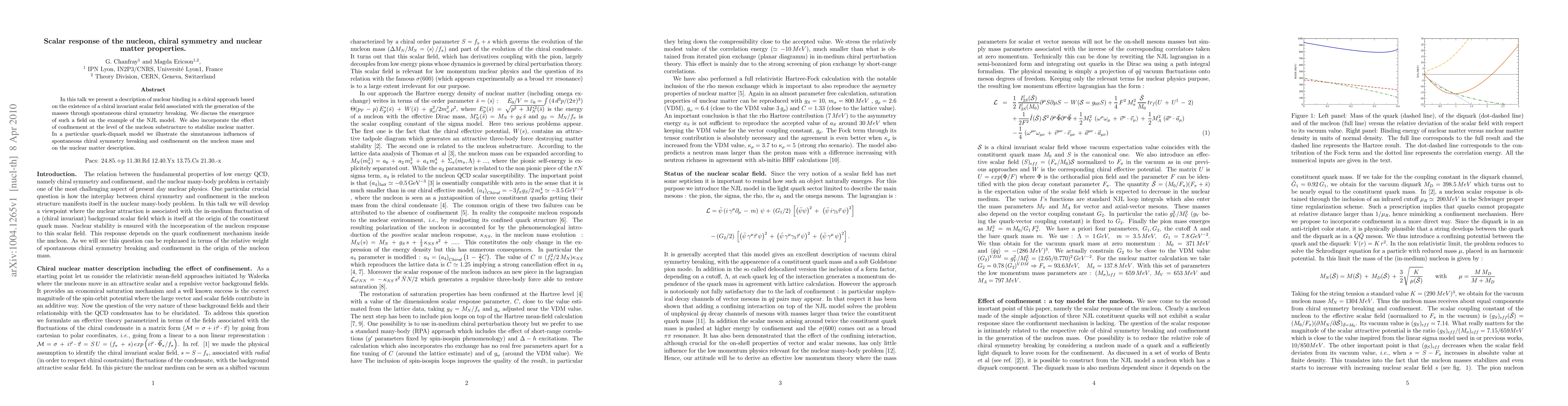 This paper explores nuclear binding using a chiral approach that introduces a chiral invariant scalar field linked to spontaneous chiral symmetry breaking, exemplified through the NJL model. It also examines how confinement influences nucleon structure and stabilizes nuclear matter, demonstrating these effects in a quark-diquark model.