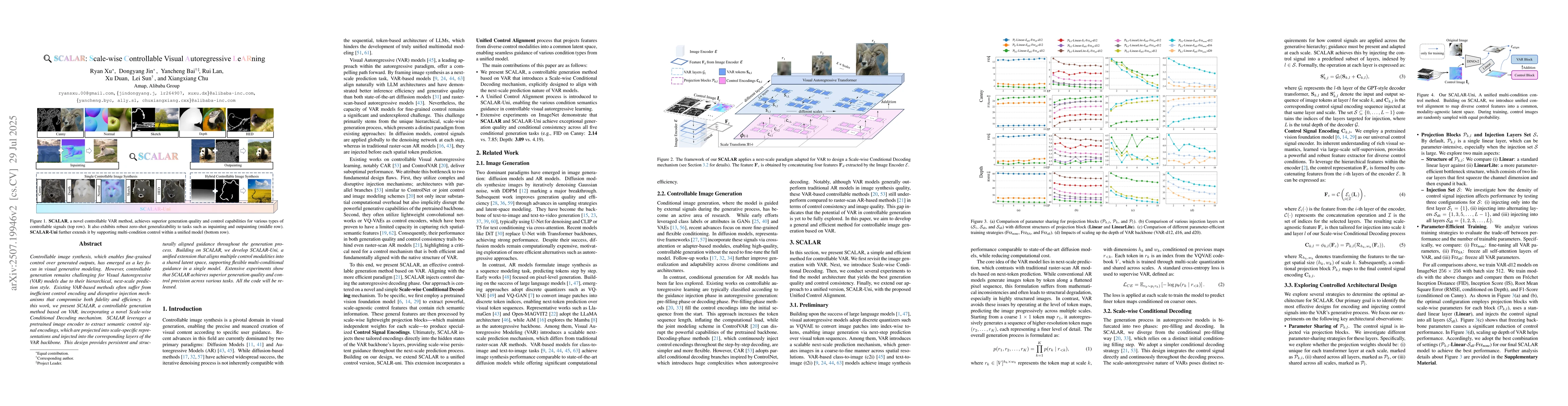 The research introduces SCALAR, a novel method for controllable image synthesis using Visual Autoregressive models. SCALAR employs a Scale-wise Conditional Decoding mechanism, leveraging a pretrained image encoder to extract and inject scale-specific control signal encodings into the VAR backbone, ensuring persistent and aligned guidance during generation. Additionally, SCALAR-Uni extends this method to support multiple control modalities in a shared latent space, demonstrating superior generation quality and control precision across various tasks.