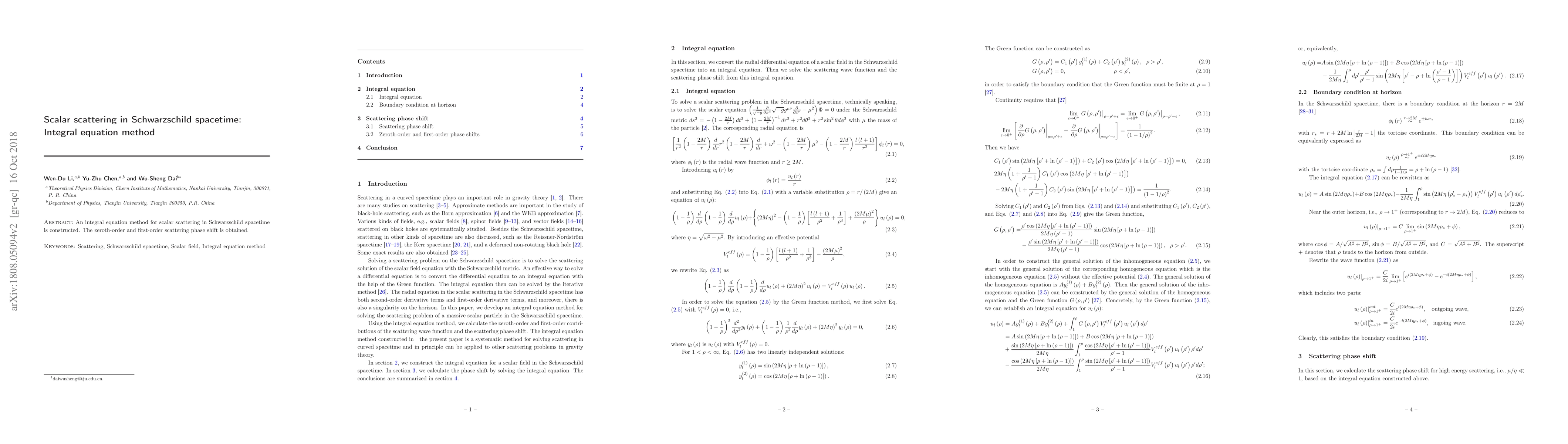 Researchers developed an integral equation method to study scalar scattering in Schwarzschild spacetime, revealing zeroth-order and first-order phase shift values.