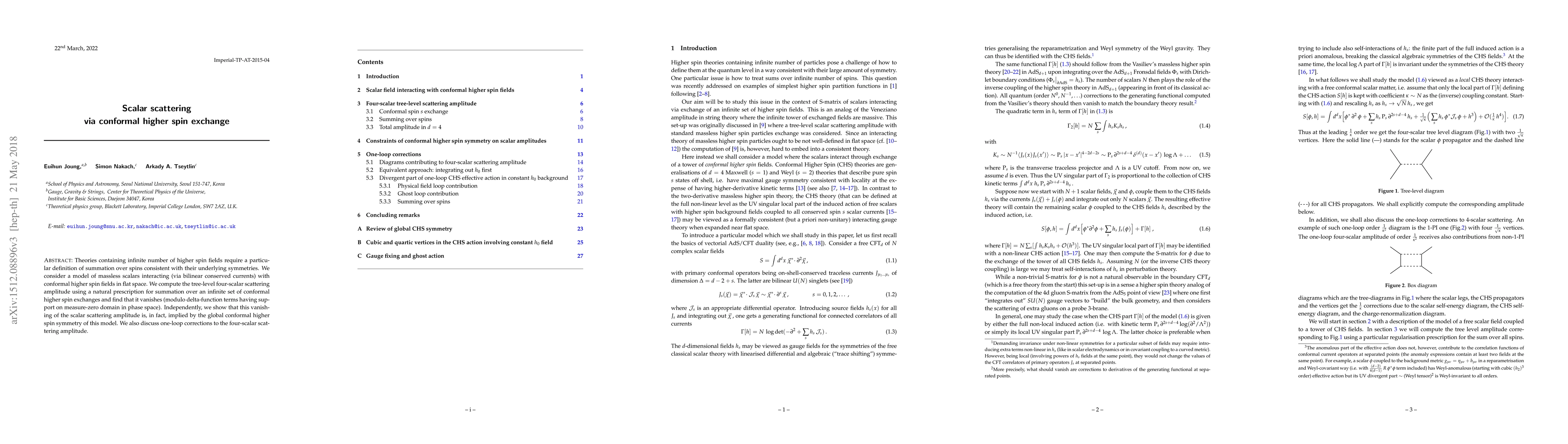 Theories containing infinite number of higher spin fields require a particular definition of summation over spins consistent with their underlying symmetries. We consider a model of massless scalars interacting (via bilinear conserved currents) with conformal higher spin fields in flat space. We compute the tree-level four-scalar scattering amplitude using a natural prescription for summation over an infinite set of conformal higher spin exchanges and find that it vanishes (modulo delta-function terms having support on measure-zero domain in phase space). Independently, we show that this vanishing of the scalar scattering amplitude is, in fact, implied by the global conformal higher spin symmetry of this model. We also discuss one-loop corrections to the four-scalar scattering amplitude.