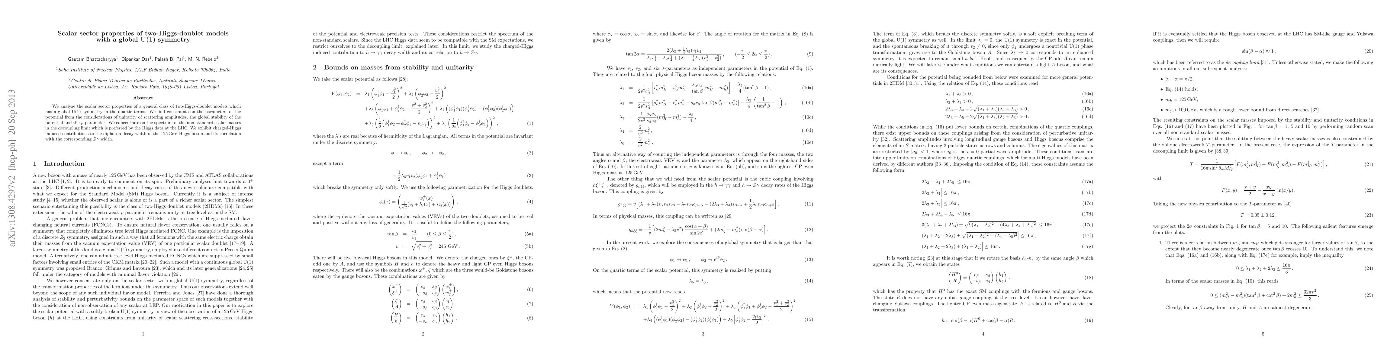 We analyze the scalar sector properties of a general class of two-Higgs-doublet models which has a global U(1) symmetry in the quartic terms. We find constraints on the parameters of the potential from the considerations of unitarity of scattering amplitudes, the global stability of the potential and the $\rho$-parameter. We concentrate on the spectrum of the non-standard scalar masses in the decoupling limit which is preferred by the Higgs data at the LHC. We exhibit charged-Higgs induced contributions to the diphoton decay width of the 125\,GeV Higgs boson and its correlation with the corresponding $Z\gamma$ width.