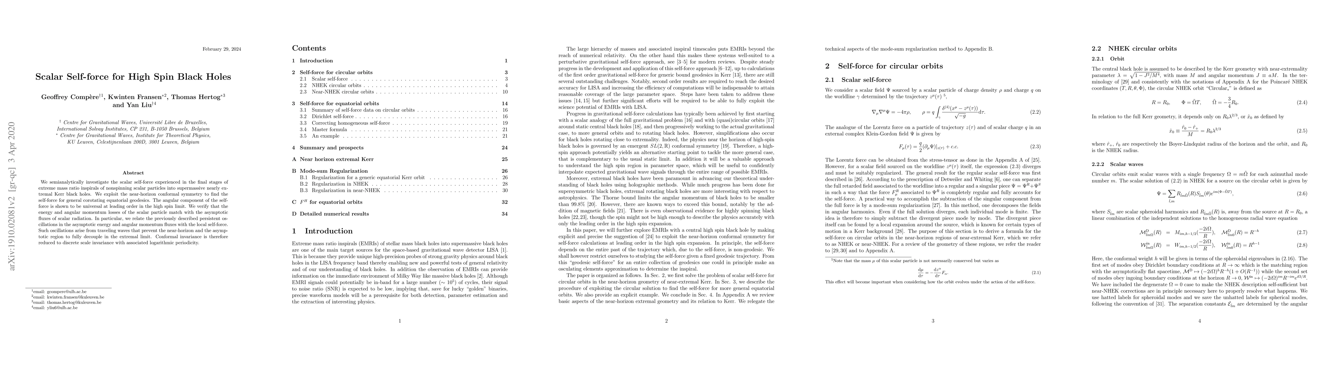 The paper presents a detailed analysis of the scalar self-force using near-horizon conformal symmetry, demonstrating a universal angular component at leading order in the high spin limit and verifying energy and angular momentum losses with scalar radiation fluxes.