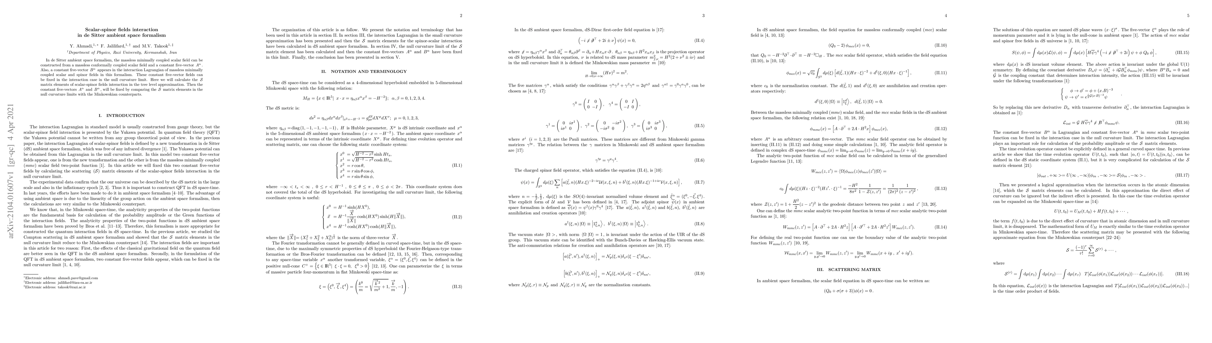 In de Sitter ambient space formalism, the massless minimally coupled scalar field can be constructed from a massless conformally coupled scalar field and a constant five-vector $A^{\alpha}$. Also, a constant five-vector $B^{\alpha}$ appears in the interaction Lagrangian of massless minimally coupled scalar and spinor fields in this formalism. These constant five-vector fields can be fixed in the interaction case in the null curvature limit. Here we will calculate the $\cal S$ matrix elements of scalar-spinor fields interaction in the tree level approximation. Then the constant five-vectors $A^{\alpha}$ and $B^{\alpha}$, will be fixed by comparing the $\cal S$ matrix elements in the null curvature limits with the Minkowskian counterparts.