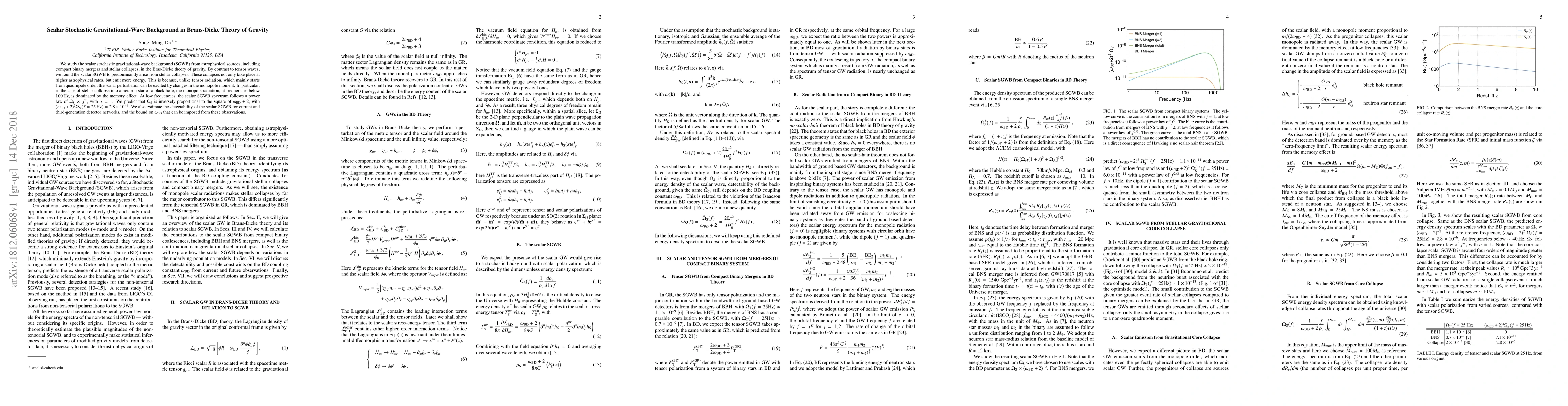 This paper explores the scalar stochastic gravitational-wave background (SGWB) in Brans-Dicke theory, finding that it predominantly arises from stellar collapses rather than compact binary mergers. The scalar SGWB spectrum follows a power law at low frequencies, and its detectability is estimated for current and future detectors.