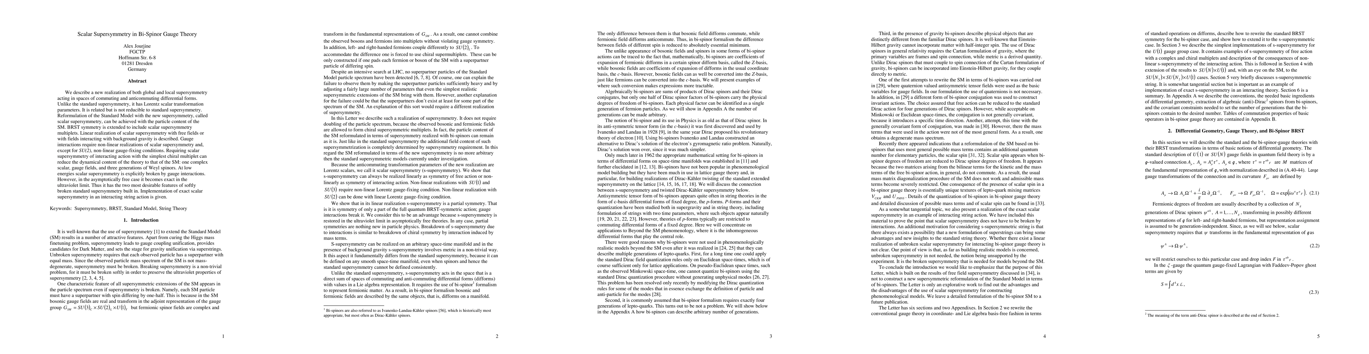 We describe a new realization of both global and local supersymmetry acting in spaces of commuting and anticommuting differential forms. Unlike the standard supersymmetry, it has Lorentz scalar transformation parameters. It is related but is not reducible to standard supersymmetry. Reformulation of the Standard Model with the new supersymmetry, called scalar supersymmetry, can be achieved with the particle content of the SM. BRST symmetry is extended to include scalar supersymmetry multiplets. Linear realization of scalar supersymmetry with free fields or with fields interacting with background gravity is described. Gauge interactions require non-linear realizations of scalar supersymmetry and, except for SU(2), non-linear gauge-fixing conditions. Requiring scalar supersymmetry of interacting action with the simplest chiral multiplet can reduce the dynamical content of the theory to that of the SM: one complex scalar, gauge fields, and three generations of Weyl spinors. At low energies scalar supersymmetry is explicitly broken by gauge interactions. However, in the asymptotically free case it becomes exact in the ultraviolet limit. Thus it has the two most desirable features of softly broken standard supersymmetry built in. Implementation of exact scalar supersymmetry in an interacting string action is given.