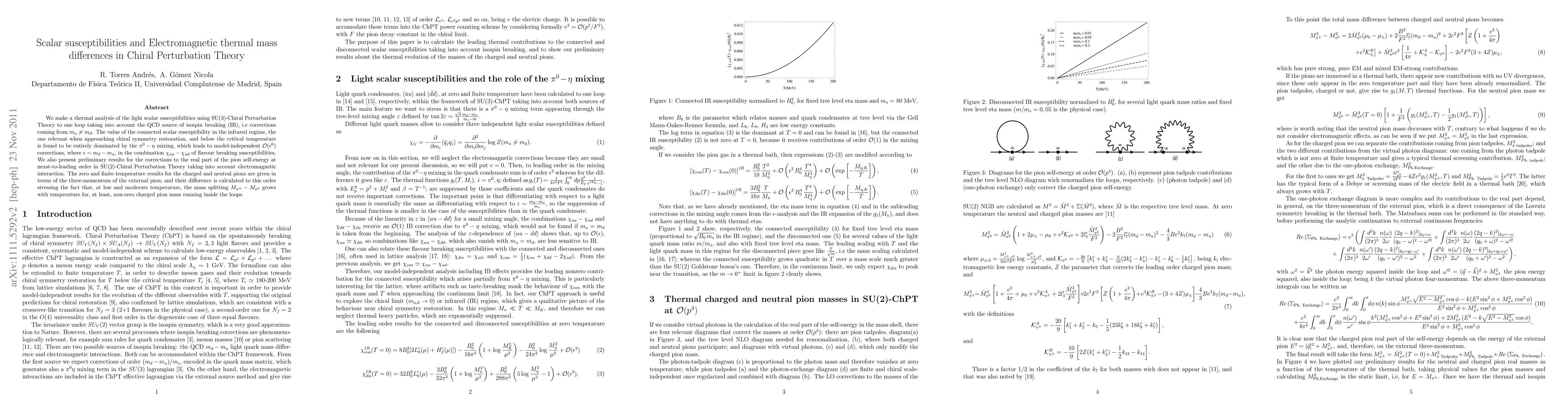 We make a thermal analysis of the light scalar susceptibilities using SU(3)-Chiral Perturbation Theory to one loop taking into account the QCD source of isospin breaking (IB), i.e corrections coming from $m_u\neq m_d$. The value of the connected scalar susceptibility in the infrared regime, the one relevant when approaching chiral symmetry restoration, and below the critical temperature is found to be entirely dominated by the $\pi^0-\eta$ mixing, which leads to model-independent $\mathcal{O}(\epsilon^0)$ corrections, where $\epsilon\sim m_d-m_u$, in the combination $\chi_{uu}-\chi_{ud}$ of flavour breaking susceptibilities. We also present preliminary results for the corrections to the real part of the pion self-energy at nexst-to-leading order in SU(2)-Chiral Perturbation Theory taking into account electromagnetic interaction. The zero and finite temperature results for the charged and neutral pions are given in terms of the three-momentum of the external pion; and their difference is calculated to this order stressing the fact that, at low and moderate temperature, the mass splitting $M_{\pi^\pm}-M_{\pi^0}$ grows with temperature for, at least, non-zero charged pion mass running inside the loops.