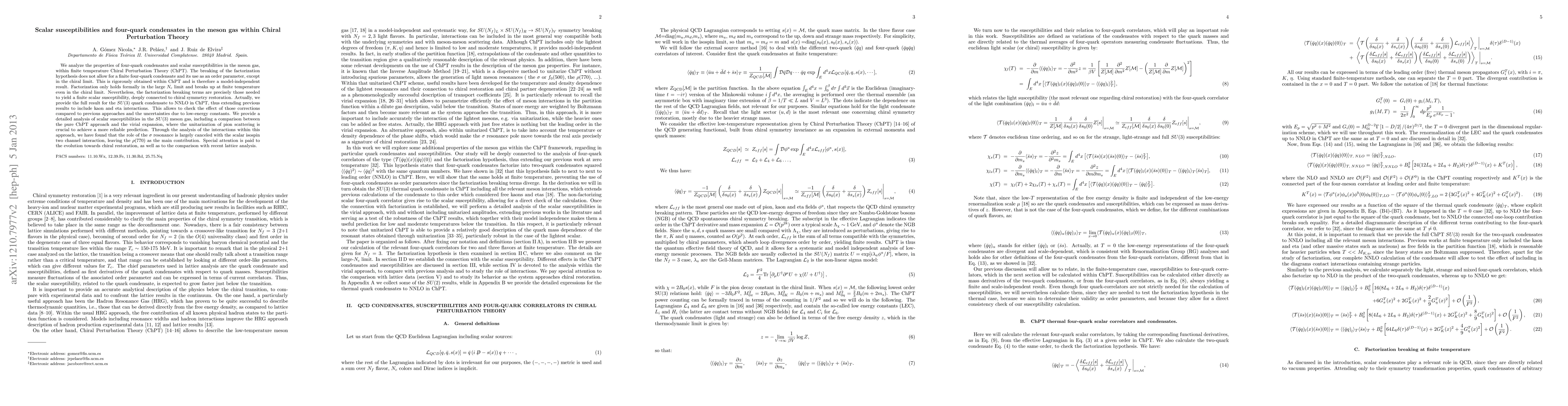 This paper investigates four-quark condensates and scalar susceptibilities in a meson gas using finite temperature Chiral Perturbation Theory (ChPT), finding that factorization breaks down, invalidating the use of four-quark condensates as an order parameter. It provides detailed results for the SU(3) quark condensate to NNLO in ChPT, highlighting the role of the $\rho(770)$ resonance and comparing ChPT predictions with lattice analysis.