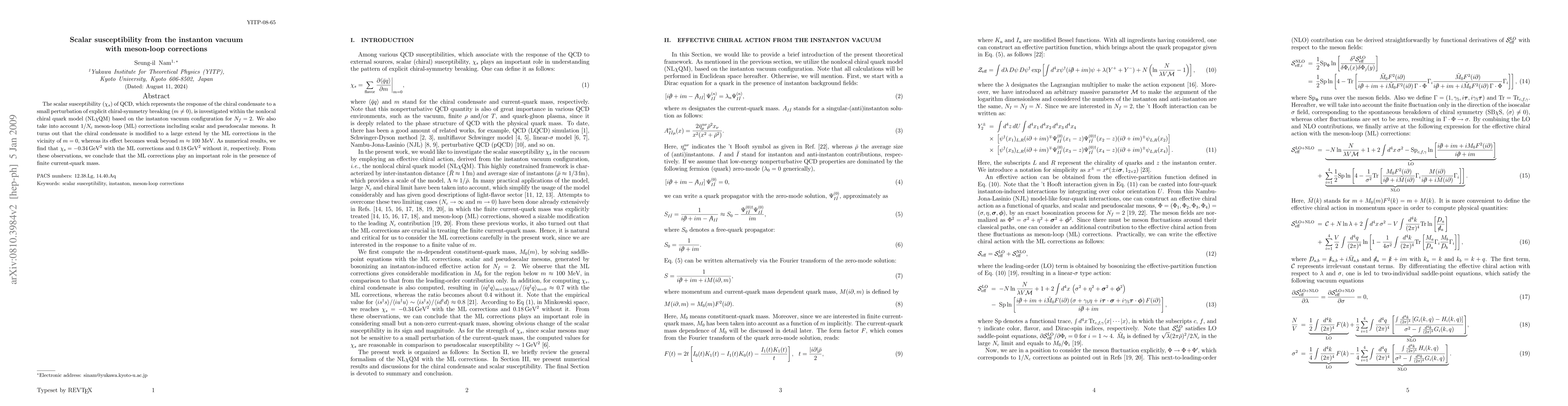 This paper investigates the scalar susceptibility (chi_s) in QCD using the nonlocal chiral quark model, incorporating instanton vacuum and meson-loop corrections. The study finds that meson-loop corrections significantly modify the chiral condensate near zero current-quark mass, resulting in chi_s = -0.34 GeV^2 with corrections and 0.18 GeV^2 without, highlighting the importance of these corrections.