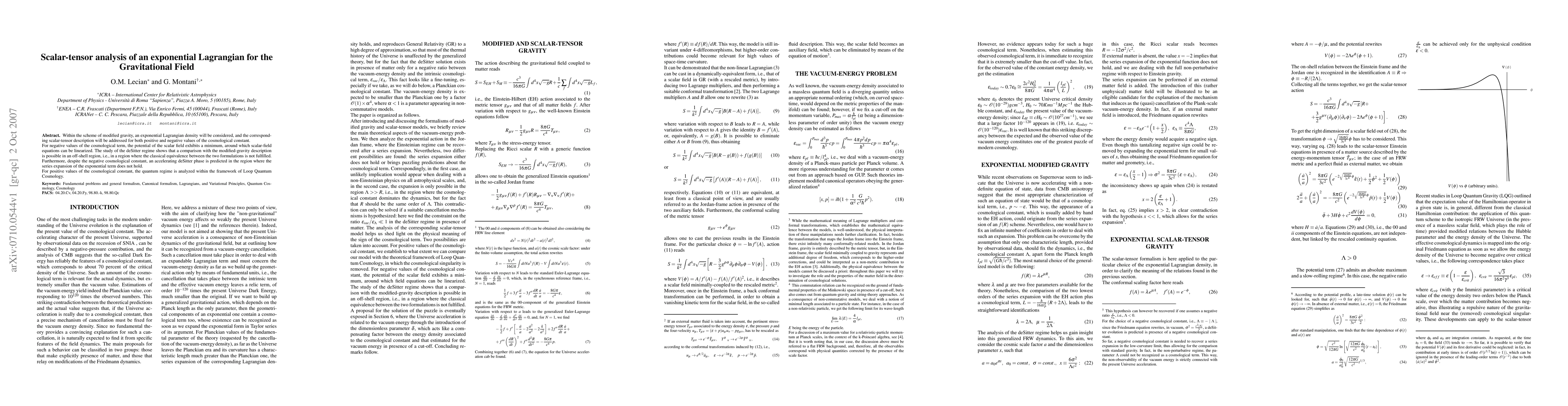 Researchers analyze an exponential Lagrangian for the gravitational field in modified gravity theories, finding accelerating deSitter phases under certain conditions despite negative cosmological constants, and exploring quantum regimes in Loop Quantum Cosmology for positive values.