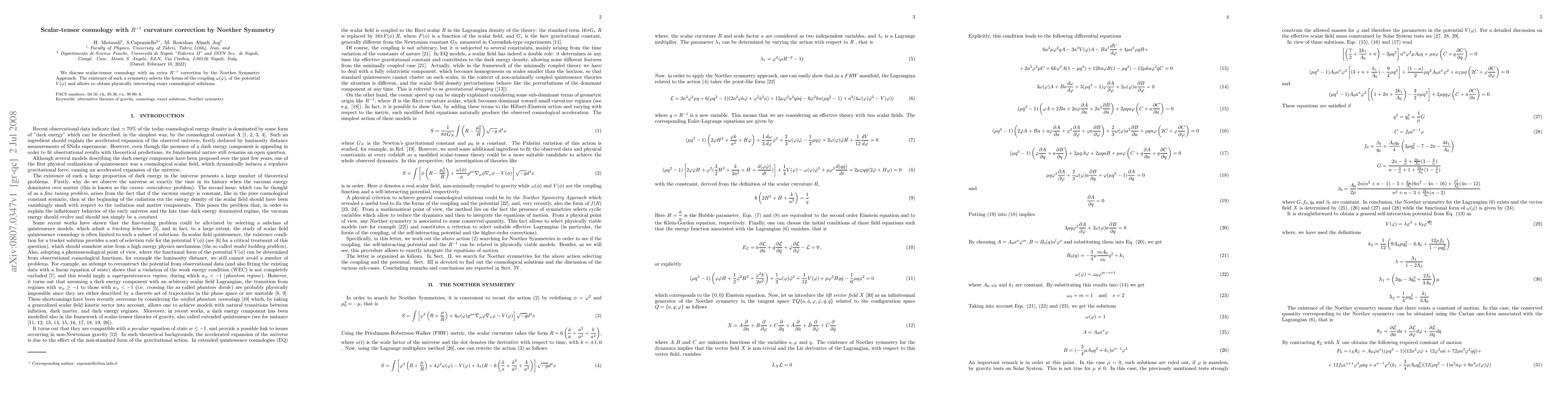 We discuss scalar-tensor cosmology with an extra $R^{-1}$ correction by the Noether Symmetry Approach. The existence of such a symmetry selects the forms of the coupling $\omega(\phi)$, of the potential $V(\phi)$ and allows to obtain physically interesting exact cosmological solutions.