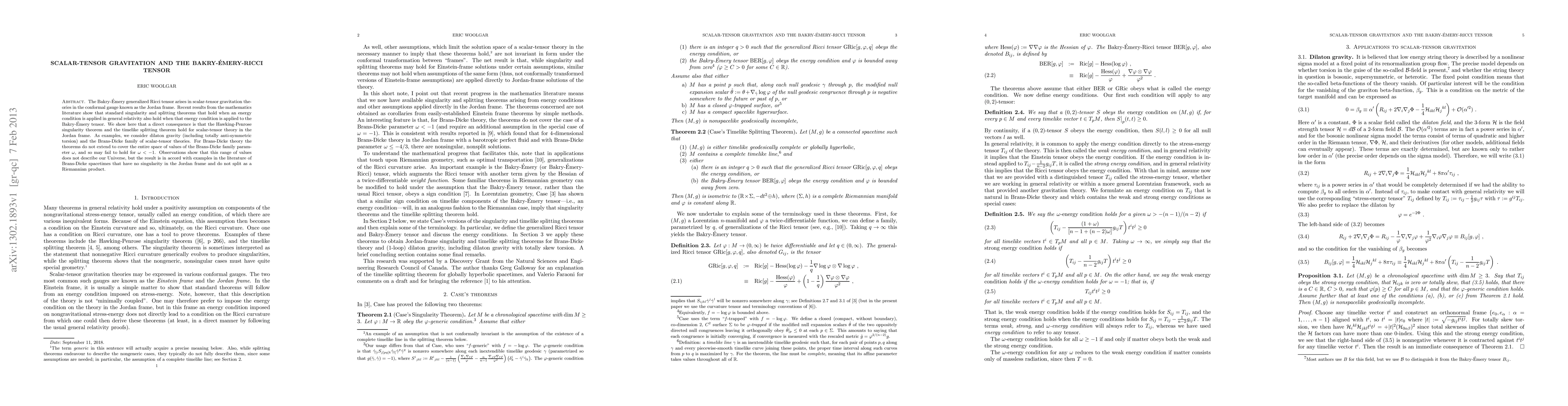 The Bakry-Emery generalized Ricci tensor arises in scalar-tensor gravitation theories in the conformal gauge known as the Jordan frame. Recent results from the mathematics literature show that standard singularity and splitting theorems that hold when an energy condition is applied in general relativity also hold when that energy condition is applied to the Bakry-Emery tensor. We show here that a direct consequence is that the Hawking-Penrose singularity theorem and the timelike splitting theorem hold for scalar-tensor theory in the Jordan frame. As examples, we consider dilaton gravity (including totally anti-symmetric torsion) and the Brans-Dicke family of scalar-tensor theories. For Brans-Dicke theory the theorems do not extend to cover the entire space of values of the Brans-Dicke family parameter omega, and so may fail to hold for omega<-1. Observations show that this range of values does not describe our Universe, but the result is in accord with examples in the literature of Brans-Dicke spacetimes that have no singularity in the Jordan frame and do not split as a Riemannian product.
