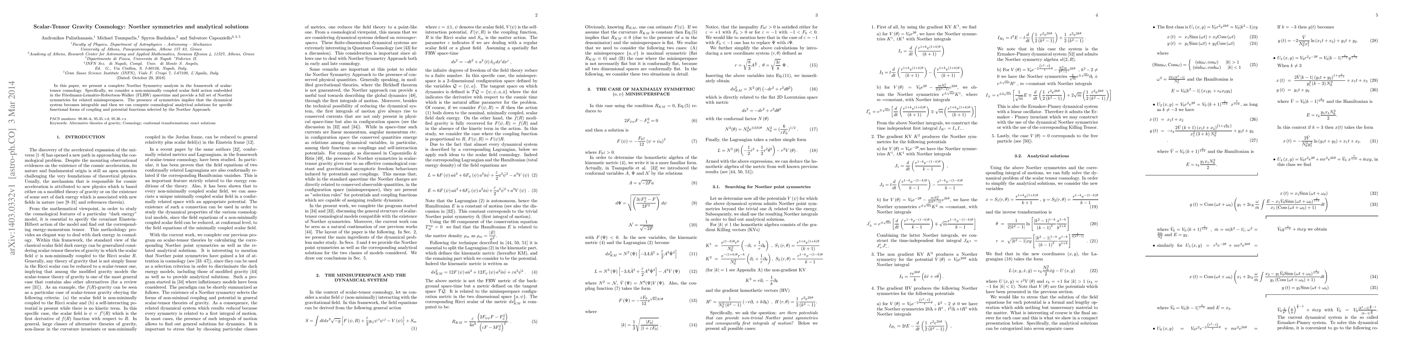 This paper conducts a Noether Symmetry analysis in scalar-tensor cosmology, revealing integrable dynamical systems that allow for analytical solutions in FLRW spacetime for specific scalar field couplings and potentials. The study identifies a full set of symmetries for related minisuperspaces.
