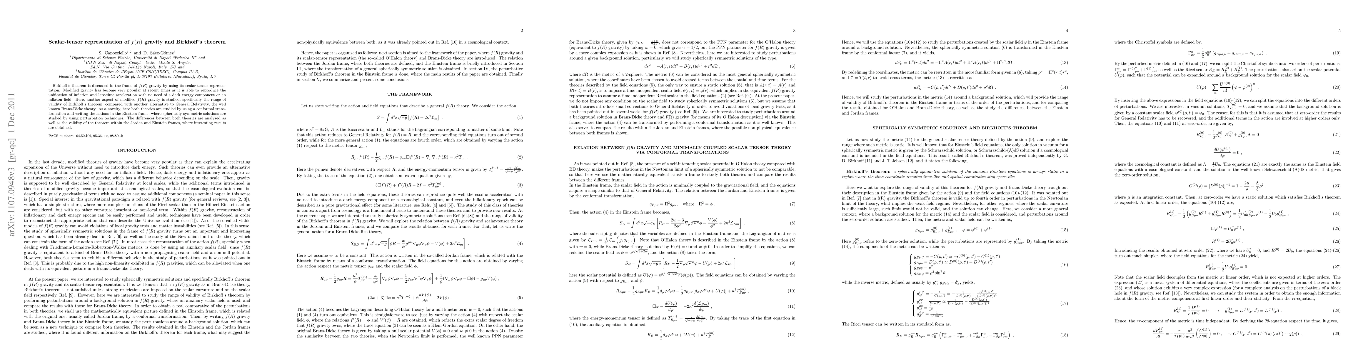 Birkhoff's theorem is discussed in the frame of f(R) gravity by using its scalar-tensor representation. Modified gravity has become very popular at recent times as it is able to reproduce the unification of inflation and late-time acceleration with no need of a dark energy component or an inflaton field. Here, another aspect of modified f(R) gravity is studied, specifically the range of validity of Birkhoff's theorem, compared with another alternative to General Relativity, the well known Brans-Dicke theory. As a novelty, here both theories are studied by using a conformal transformation and writing the actions in the Einstein frame, where spherically symmetric solutions are studied by using perturbation techniques. The differences between both theories are analyzed as well as the validity of the theorem within the Jordan and Einstein frames, where interesting results are obtained.