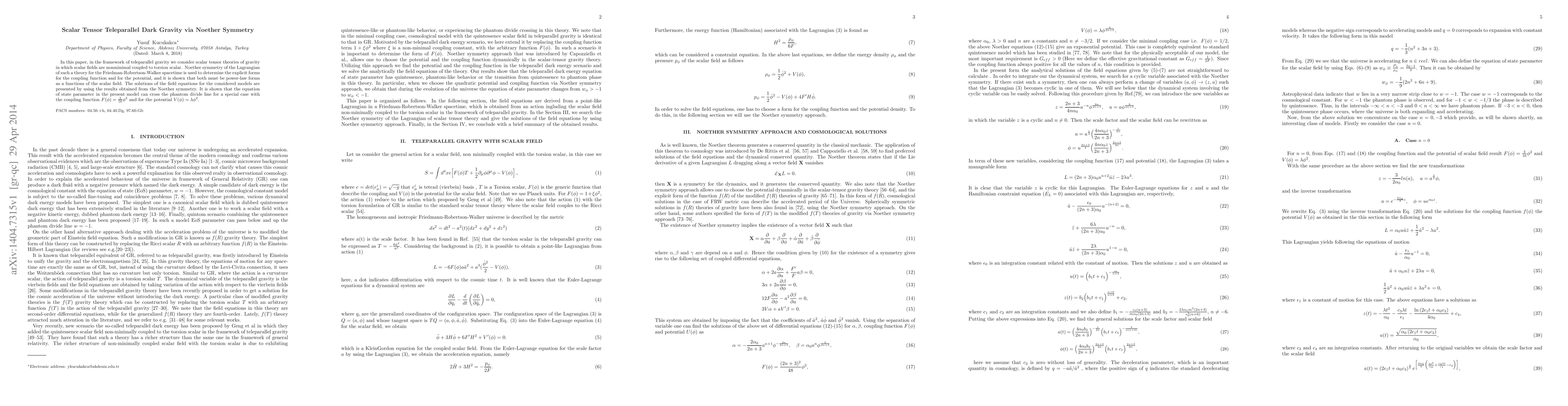 In this paper, in the framework of teleparallel gravity we consider scalar tensor theories of gravity in which scalar fields are nonminimal coupled to torsion scalar. Noether symmetry of the Lagrangian of such a theory for the Friedman-Robertson-Walker spacetime is used to determine the explicit forms for the coupling function and for the potential, and it is shown that both must be power-law forms as a functions of the scalar field. The solutions of the field equations for the considered models are presented by using the results obtained from the Noether symmetry. It is shown that the equation of state parameter in the present model can cross the phantom divide line for a special case with the coupling function $F(\phi) = \frac{3}{16} \phi^2$ and for the potential $V(\phi) = \lambda \phi^{2}$.